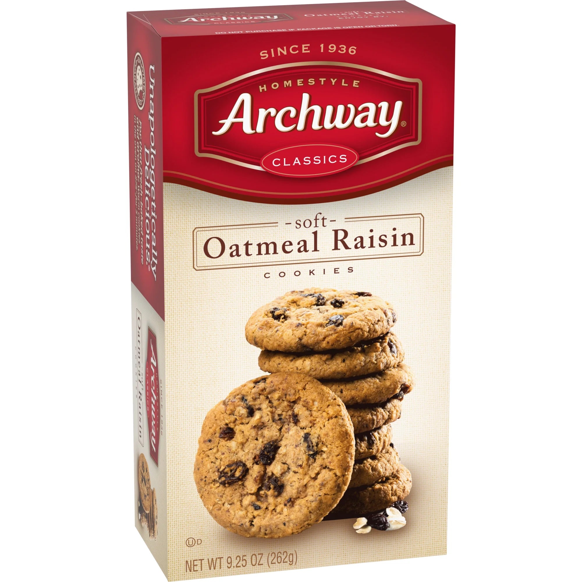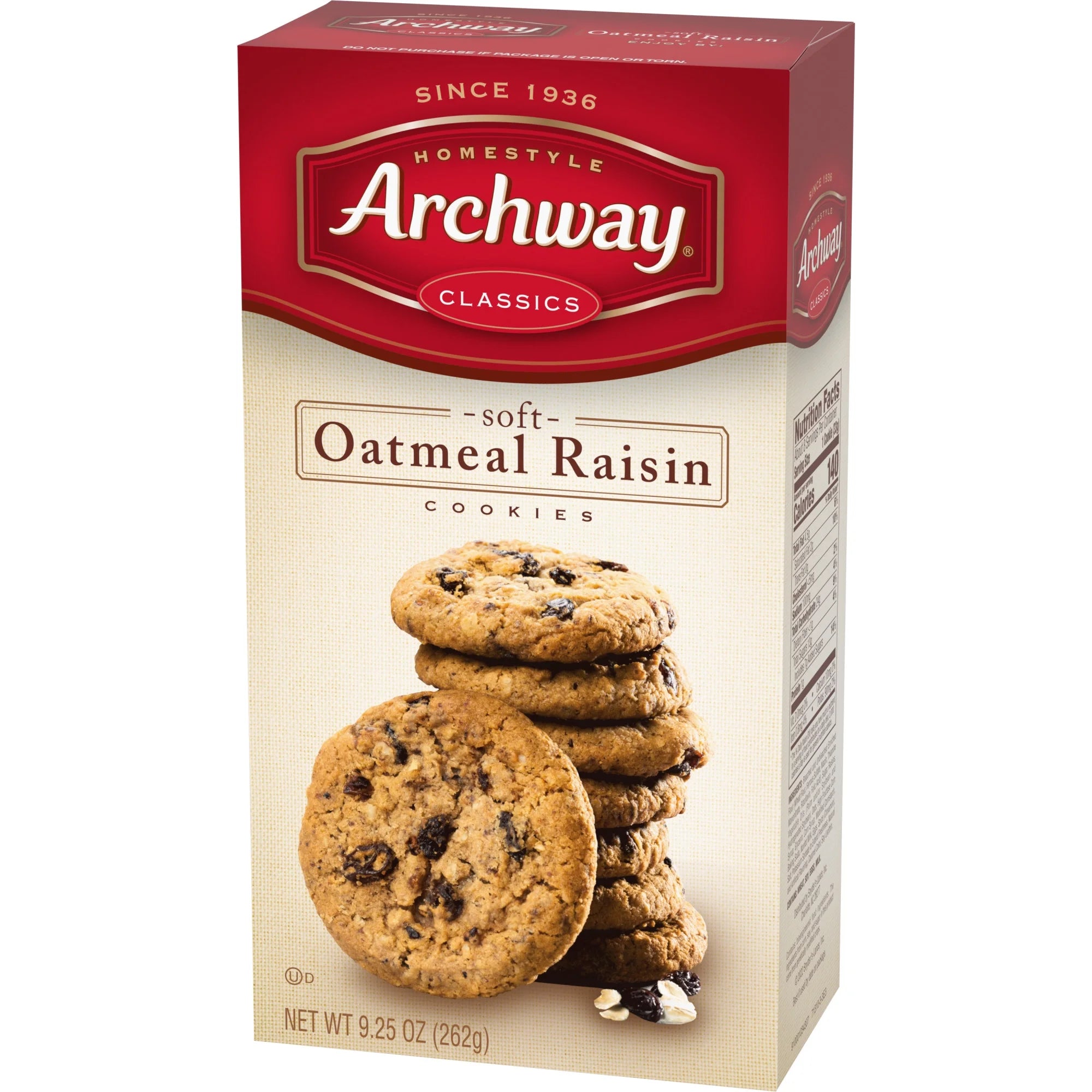 Juicy raisins in a classic oatmeal batter give you Archways Oatmeal Raisin cookies a mouthwatering homestyle treat. Thick and rich, this is a classic Archway cookie you'll know by the sweet aroma when you first open up the package. Since 1936, Archway Cookies have been winning the hearts of cookies lovers. Known for our home-style goodness, we strive to deliver high quality, highly enjoyable cookies with the ability to bring on nostalgic memories every single day. Shelf-stable product.