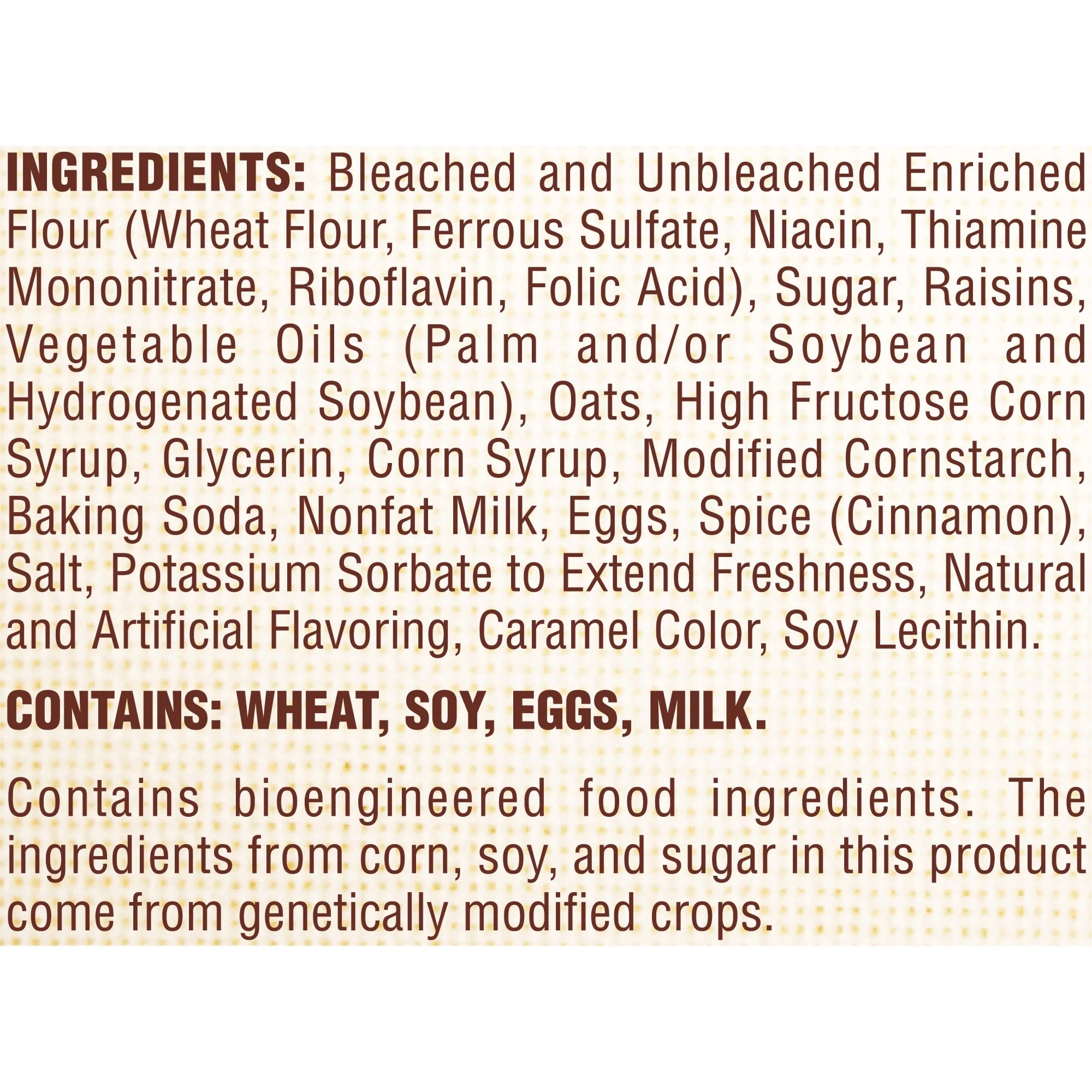 Ingredients: Bleached And Unbleached Enriched Flour (Wheat Flour, Ferrous Sulfate, Niacin, Thiamine Mononitrate, Riboflavin, Folic Acid), Sugar, Raisins, Vegetable Oils (Palm And/Or Soybean And Hydrogenated Soybean), Oats, High Fructose Corn Syrup, Glycerin, Corn Syrup, Modified Cornstarch, Baking Soda, Nonfat Milk, Eggs, Spice (Cinnamon), Salt, Potassium Sorbate To Extend Freshness, Natural And Artificial Flavoring, Caramel Color, Soy Lecithin. Contains: Wheat, Soy, Eggs, Milk./div>