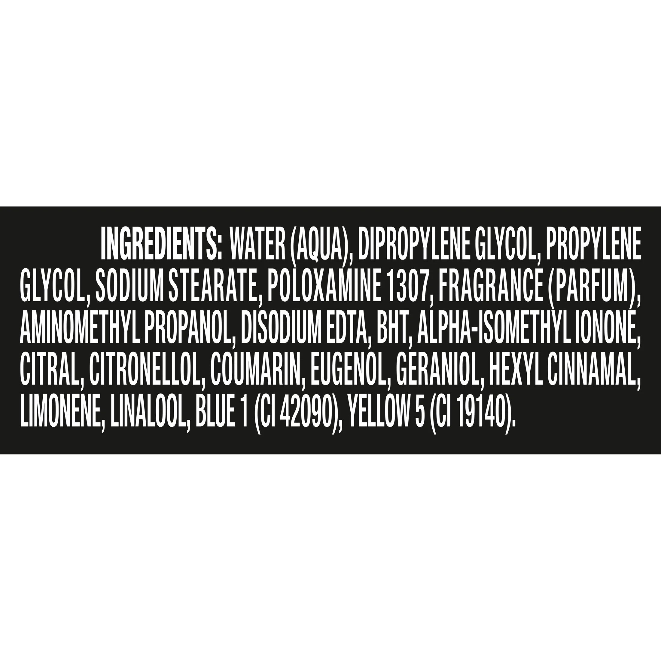 Ingredients: Water (Aqua), Dipropylene Glycol, Propylene Glycol, Sodium Stearate, Poloxamine 1307, Fragrance (Parfum), Aminomethyl Propanol, Disodium EDTA, BHT, Alpha-Isomethyl Ionone, Citral, Citronellol, Coumarin, Eugenol, Geraniol, Hexyl Cinnamal, Limonene, Linalool, Blue 1 (CI 42090), Yellow 5 (CI 19140)/div>
