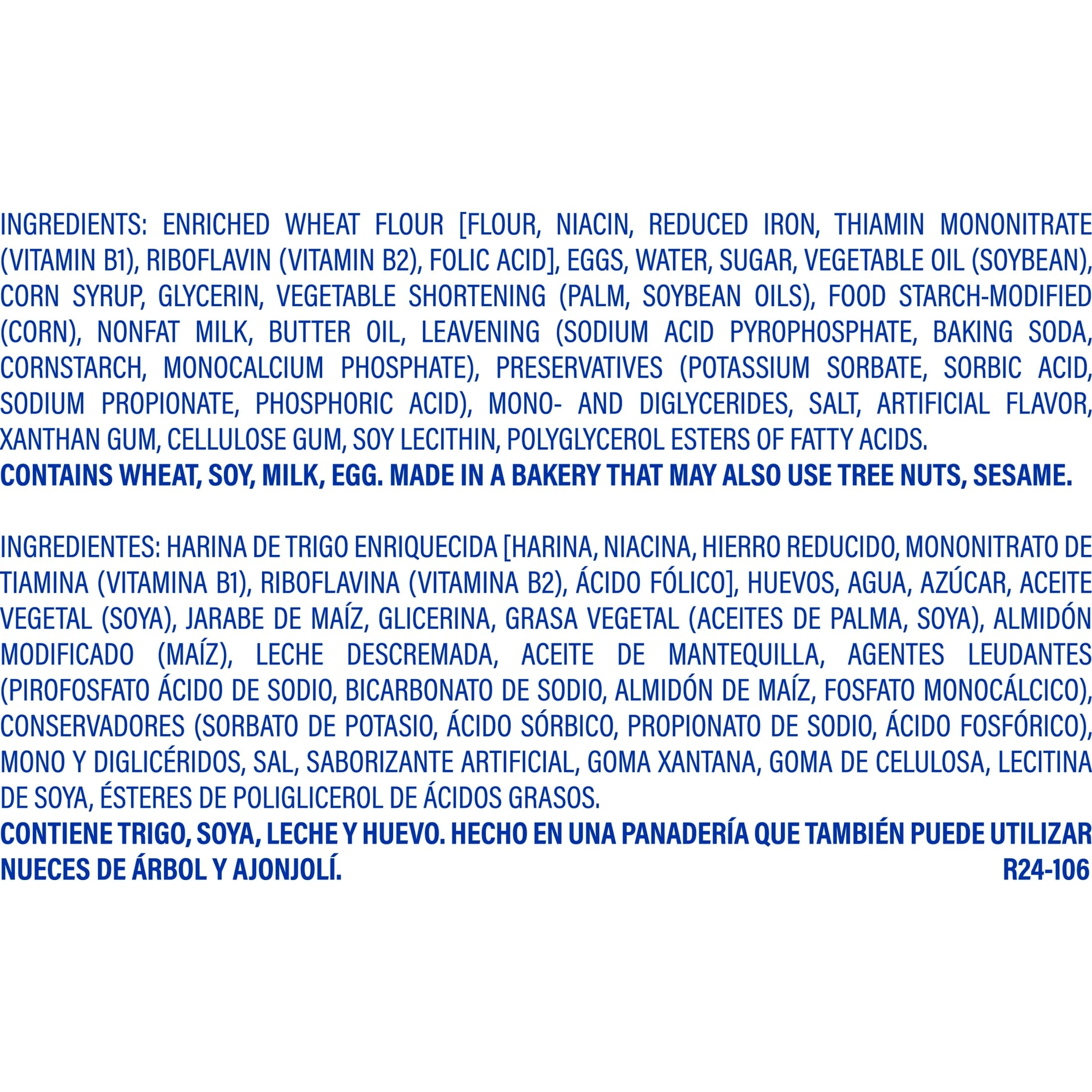 Enriched Wheat Flour [Flour, Niacin, Reduced Iron, Thiamin Mononitrate (Vitamin B1), Riboflavin (Vitamin B2), Folic Acid], Eggs, Water, Sugar, Vegetable Oil (Soybean), Corn Syrup, Glycerin, Vegetable Shortening [Palm, Soybean Oils], Food Starch Modified (Corn), Nonfat Milk, Butter Oil, Leavening [Sodium Acid Pyrophosphate, Baking Soda, Cornstarch, Monocalcium Phosphate], Preservatives [Potassium Sorbate, Sorbic Acid, Sodium Propionate, Phosphoric Acid], Mono- And Diglycerides, Salt, Artificial Flavor, Xanthan Gum, Cellulose Gum, Soy Lecithin, Polyglycerol Esters Of Fatty Acids./div>