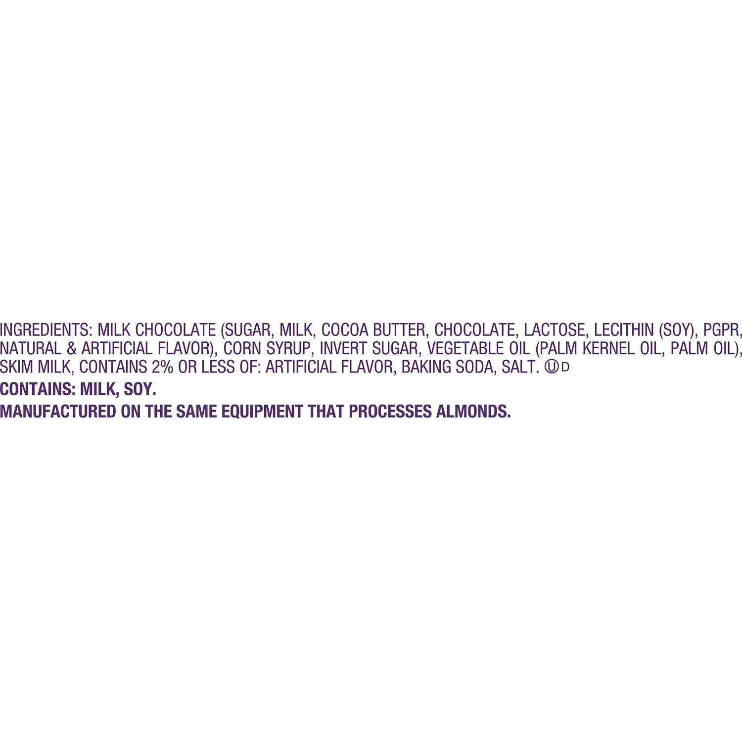 MILK CHOCOLATE (SUGAR, MILK, COCOA BUTTER, CHOCOLATE, LACTOSE, LECITHIN (SOY), PGPR, NATURAL & ARTIFICIAL FLAVOR), CORN SYRUP, INVERT SUGAR, VEGETABLE OIL (PALM KERNEL OIL, PALM OIL), SKIM MILK, CONTAINS 2% OR LESS OF: ARTIFICIAL FLAVOR, BAKING SODA, SALT./div>