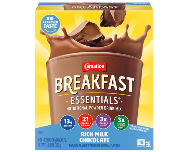 Carnation Breakfast Essentials Rich Milk Chocolate Nutritional Powder Drink mix is a powdered mix that makes a delicious breakfast drink the whole family will love—just mix with 1 cup of skim milk. Start your day right with this chocolate drink mix with 13 grams of protein and 220 calories per prepared serving. Carnation Breakfast Essentials Rich Milk Chocolate powder drink mix is an easy breakfast shake to help families get the protein, vitamins and minerals they need to kick off their day. Each prepared serving of this breakfast drink powder has 21 vitamins and minerals, including three times the amount of Vitamin D as an eight fluid ounce glass of milk and three times as much calcium as a 5.3 ounce cup of Greek yogurt. These powdered nutritional drink mixes aren’t just great as a breakfast drink, they are great at home or on the go or between meals. The box includes ten 36 gram powder packets for convenient nutrition shakes. Carnation Breakfast Essentials nutritional shakes make it easy to start your day with good breakfast nutrition. Nutritionally appropriate for ages 4 years and older, including teens and adults.