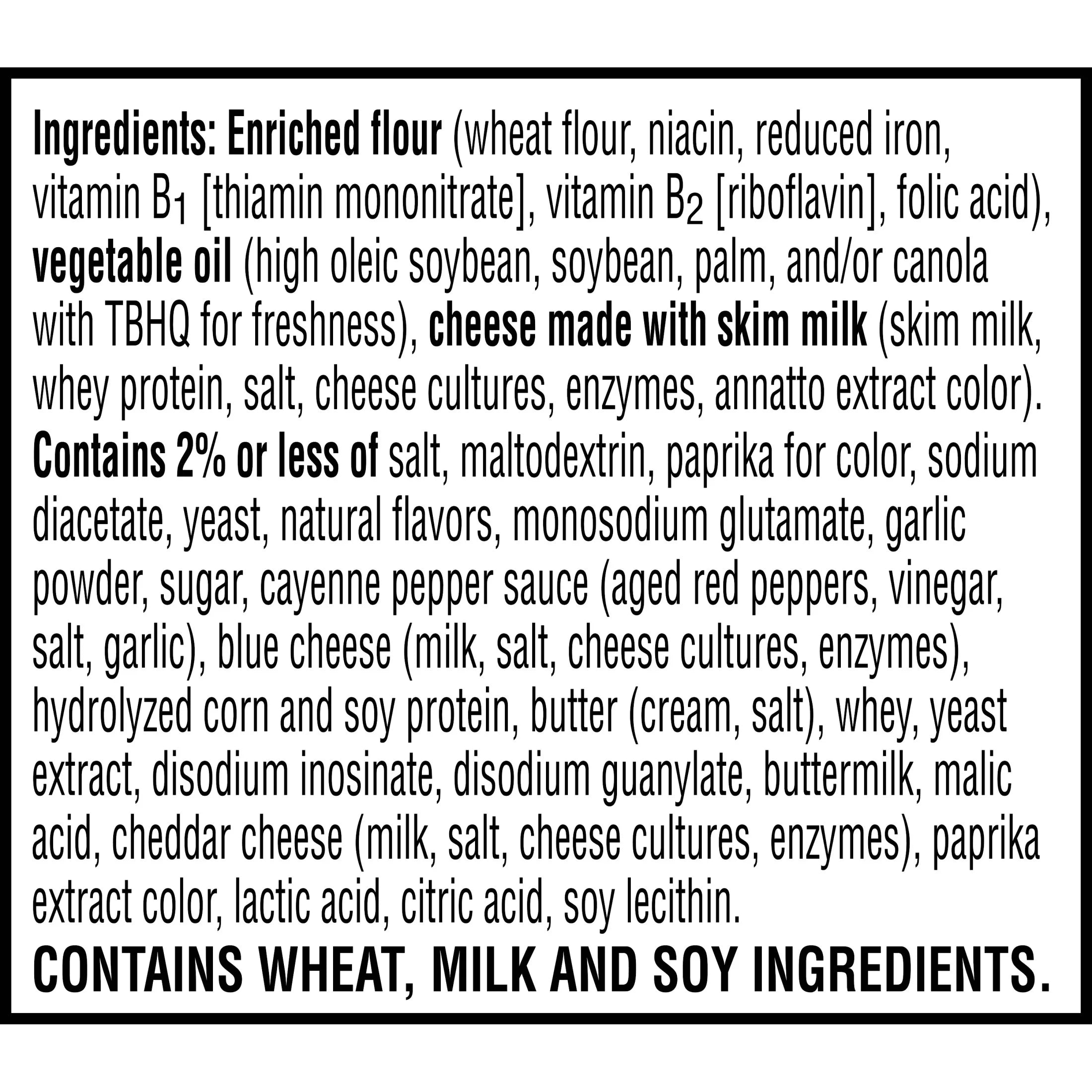 Enriched Flour (Wheat Flour, Niacin, Reduced Iron, Vitamin B1 [Thiamin Mononitrate], Vitamin B2 [Riboflavin], Folic Acid), Vegetable Oil (High Oleic Soybean, Soybean, Palm, And/Or Canola With Tbhq For Freshness), Cheese Made With Skim Milk (Skim Milk, Whey Protein, Salt, Cheese Cultures, Enzymes, Annatto Extract Color). Contains 2% Or Less Of Salt, Maltodextrin, Paprika For Color, Sodium Diacetate, Yeast, Natural Flavors, Monosodium Glutamate, Garlic Powder, Sugar, Cayenne Pepper Sauce (Aged Red Peppers, Vinegar, Salt, Garlic), Blue Cheese (Milk, Salt, Cheese Cultures, Enzymes), Hydrolyzed Corn And Soy Protein, Butter (Cream, Salt), Whey, Yeast Extract, Disodium Inosinate, Disodium Guanylate, Buttermilk, Malic Acid, Cheddar Cheese (Milk, Salt, Cheese Cultures, Enzymes), Paprika Extract Color, Lactic Acid, Citric Acid, Soy Lecithin./div>
