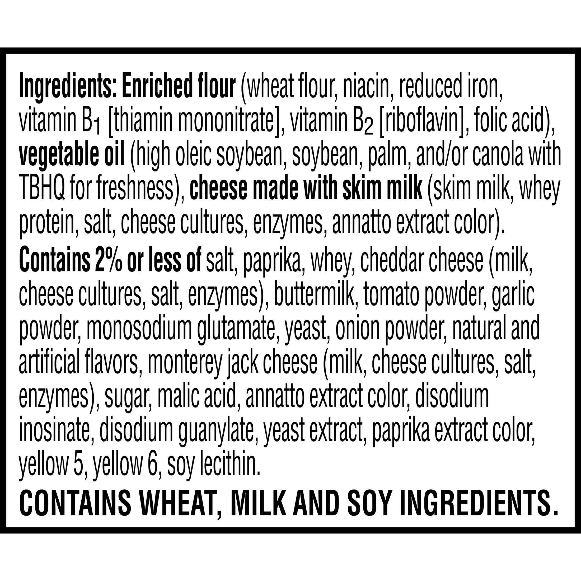 Enriched flour (wheat flour, niacin, reduced iron, vitamin B1 [thiamin mononitrate], vitamin B2 [riboflavin], folic acid), vegetable oil (high oleic soybean, soybean, palm, and/or canola with TBHQ for freshness), cheese made with skim milk (skim milk, whey protein, salt, cheese cultures, enzymes, annatto extract color). Contains 2% or less of salt, paprika, whey, cheddar cheese (milk, cheese cultures, salt, enzymes), buttermilk, tomato powder, garlic powder, monosodium glutamate, yeast, onion powder, natural and artificial flavors, monterey jack cheese (milk, cheese cultures, salt, enzymes), sugar, malic acid, annatto extract color, disodium inosinate, disodium guanylate, yeast extract, paprika extract color, yellow 5, yellow 6, soy lecithin./div>