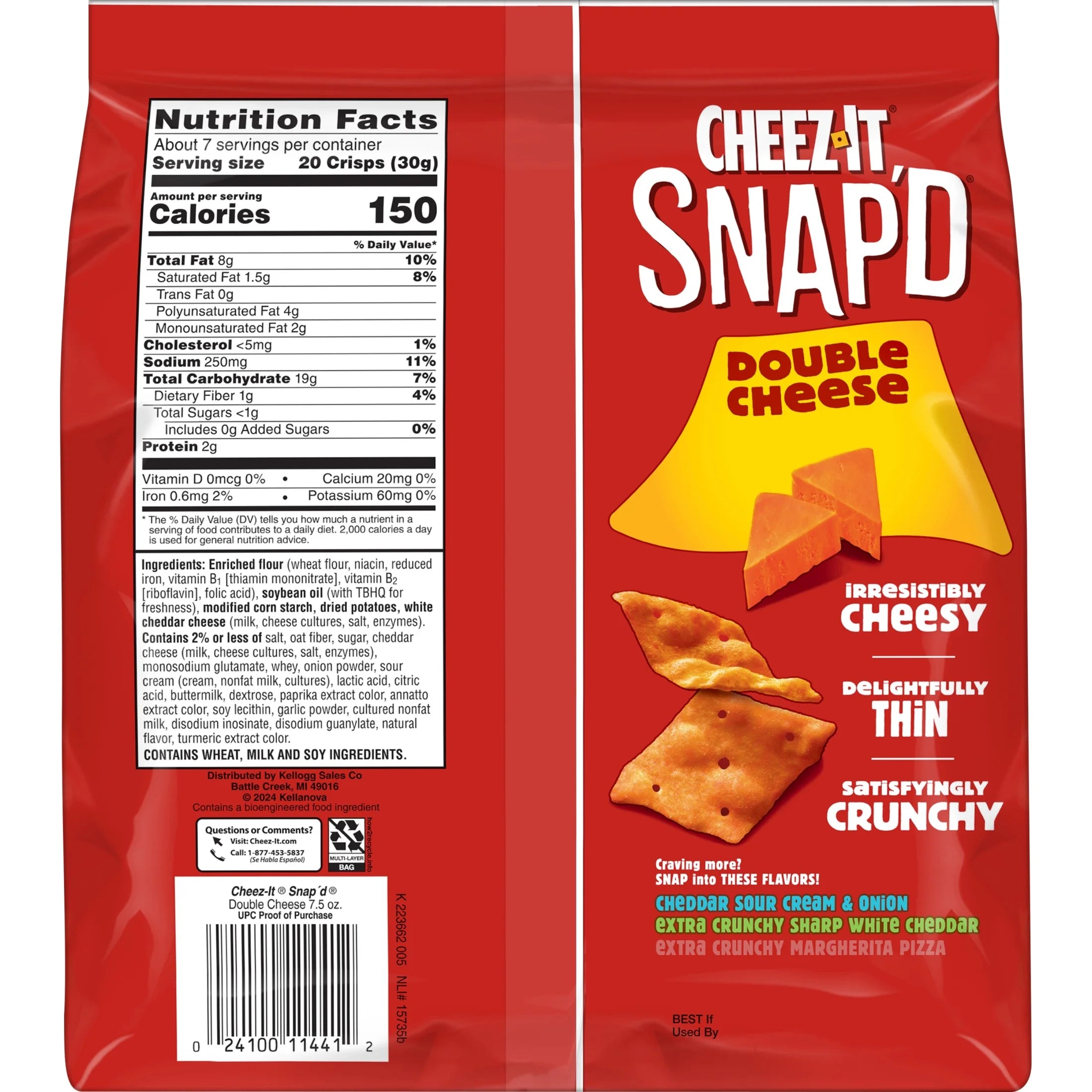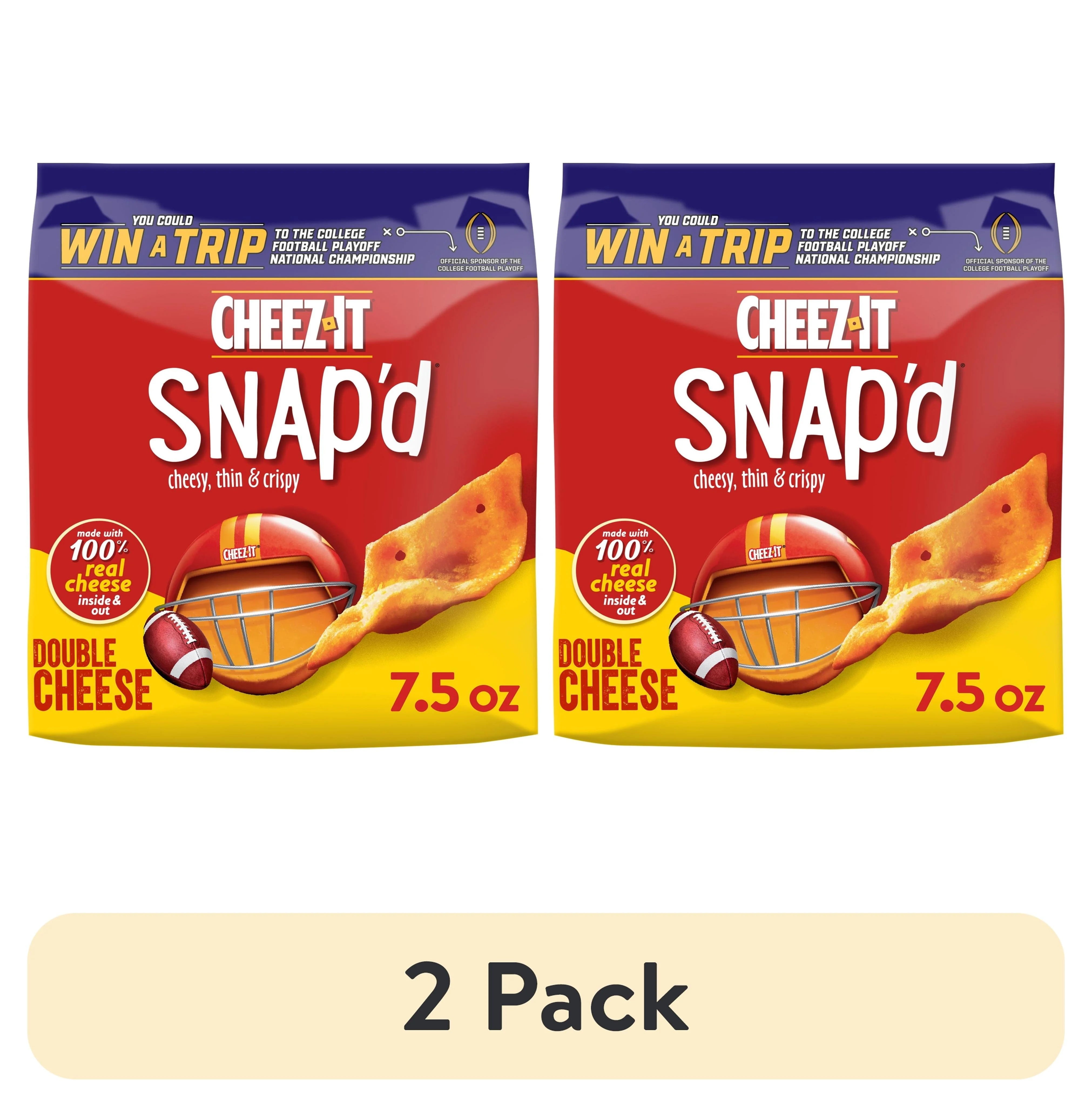 Big cheese taste inside and out, Cheez-It Snap’d Double Cheese cheese cracker chips are super thin and loaded with big double cheese flavor. Made with 100% real cheese inside and out, Cheez-It Snap'd snacks are a crowd-favorite. Snap'd snacks are delightfully thin with a crispy snap for extra crunch in every bite; Perfect for celebrating at games, adding to party spreads, pairing with sandwiches, and curing late-night savory cravings. Pack your Snap'd snacks in school lunches or as an extra snack on-the-go. With double cheese flavor, these snappy crackers are a cheese-lovers dream. Whether you're grabbing some for the office or on a road trip, you'll find a snack that's filled with big cheese flavor. Pour them into a bowl at your next party and watch them disappear one handful at a time. You'll love the bold crunch and delicious, tasty flavor of real cheese in every perfectly baked bite of Cheez-It Snap'd Double Cheese cheese cracker chips. CONTAINS WHEAT, MILK AND SOY INGREDIENTS. Shelf-Stable.