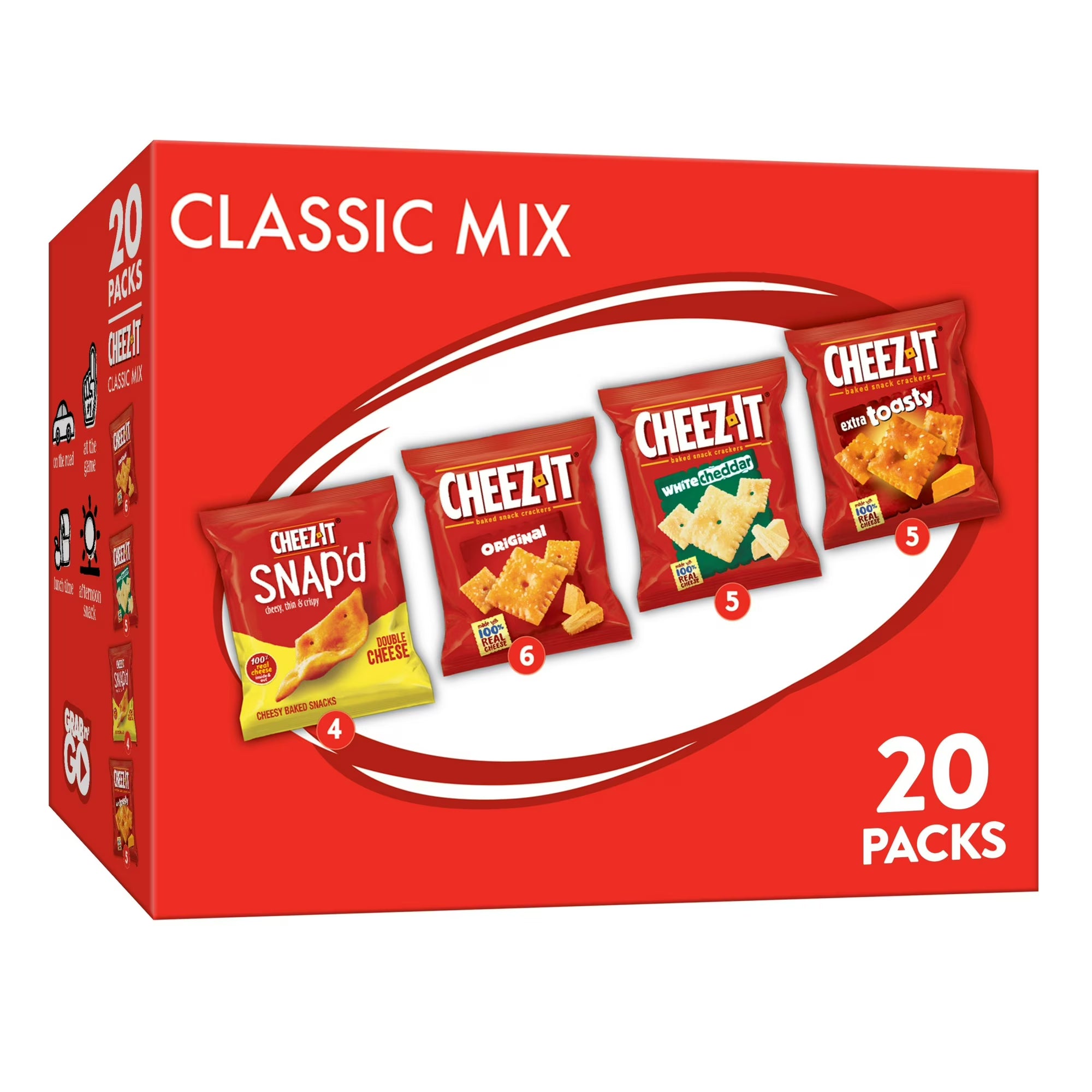 - Variety pack of Cheez-It Original, White Cheddar, and Extra Toasty and Cheez-It Snap'd Double Cheese flavors; Deliciously cheesy and crispy crackers; Shelf-Stable
