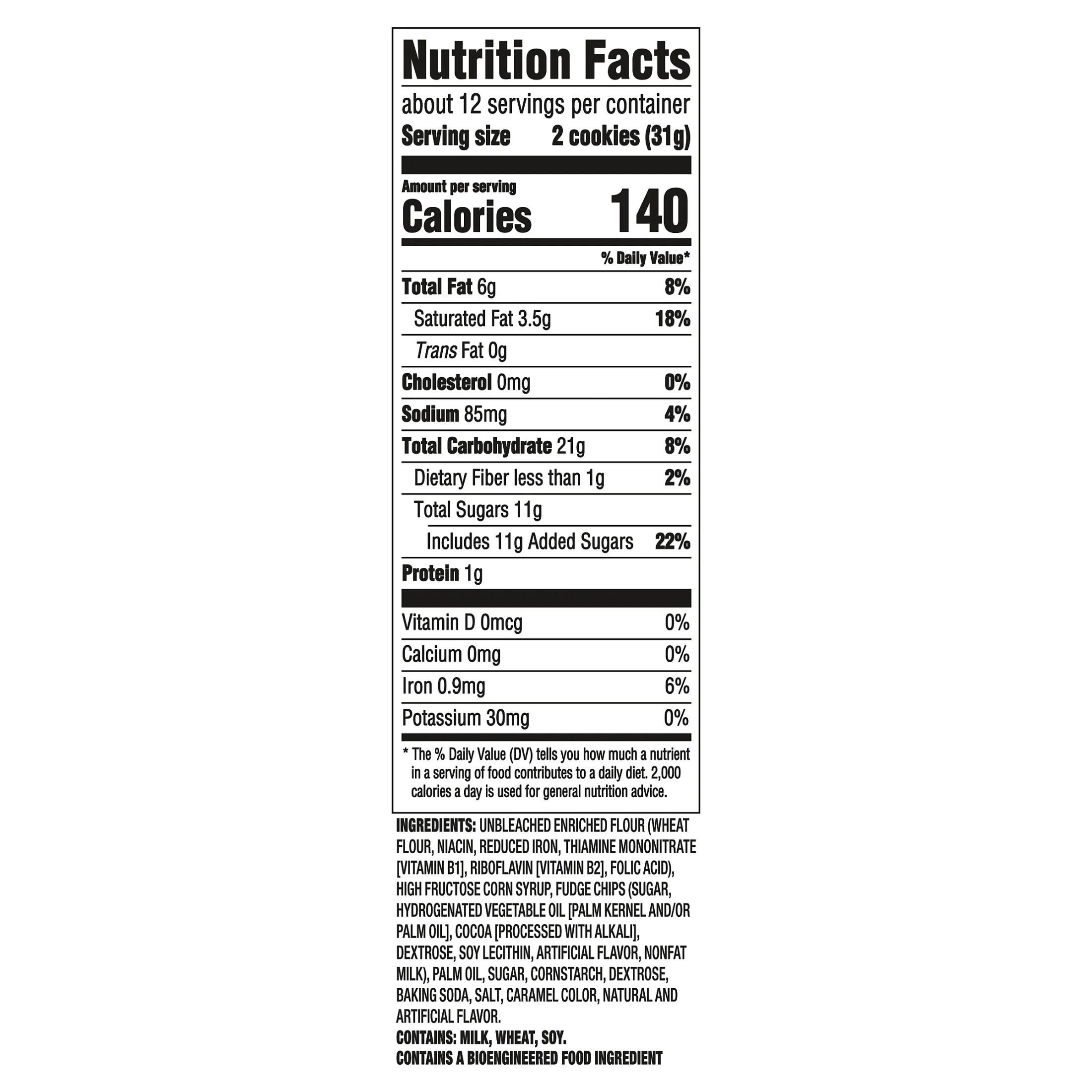Unbleached Enriched Flour (Wheat Flour, Niacin, Reduced Iron, Thiamine Mononitrate [Vitamin B1], Riboflavin [Vitamin B2], Folic Acid), High Fructose Corn Syrup, Fudge Chips (Sugar, Hydrogenated Vegetable Oil [Palm Kernel And/Or Palm Oil], Cocoa [Processed With Alkali], Dextrose, Soy Lecithin, Artificial Flavor, Nonfat Milk), Palm Oil, Sugar, Cornstarch, Dextrose, Baking Soda, Salt, Caramel Color, Natural And Artificial Flavor. Contains: Milk, Wheat, Soy./div>