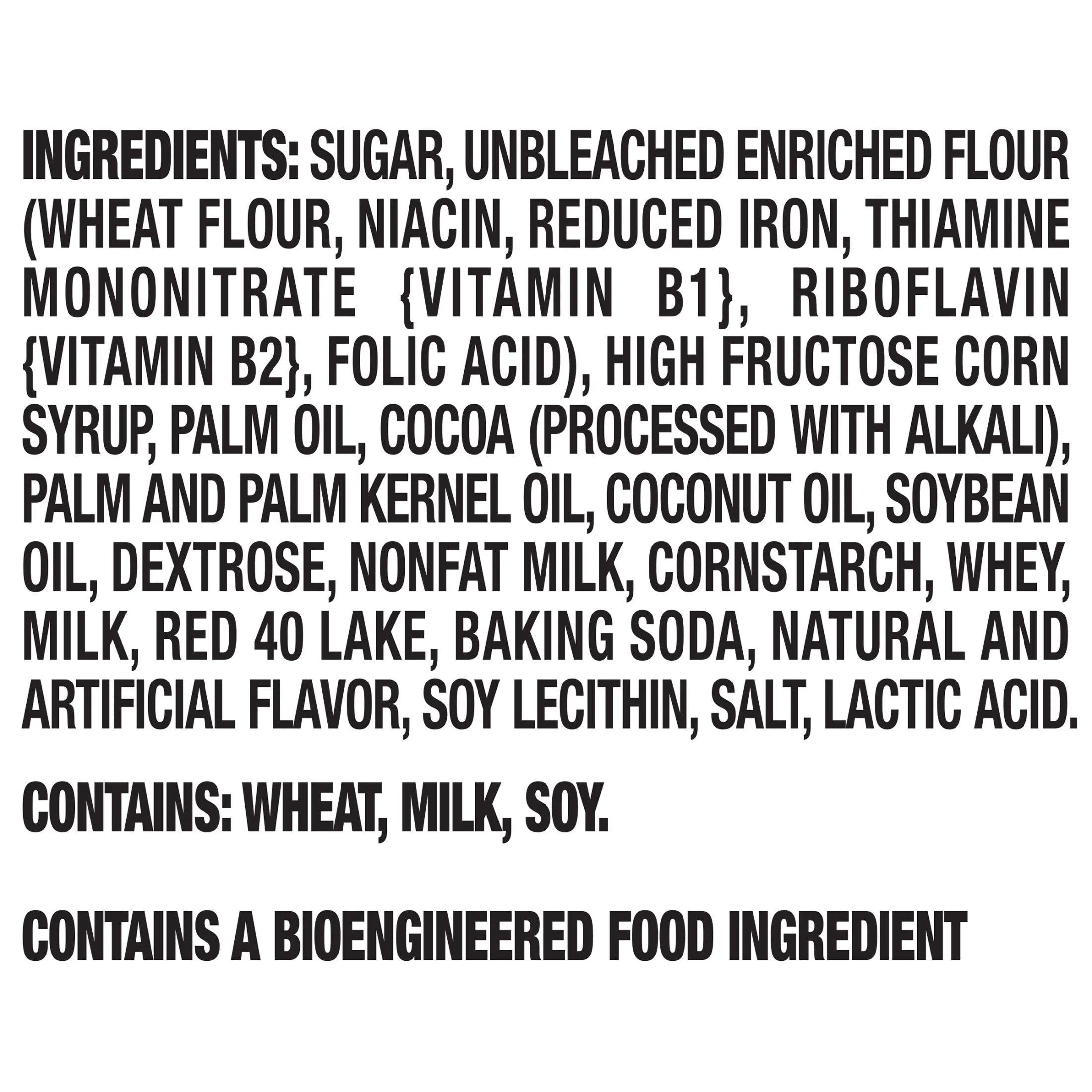 Sugar, Unbleached Enriched Flour (Wheat Flour, Niacin, Reduced Iron, Thiamine Mononitrate {Vitamin B1}, Riboflavin {Vitamin B2}, Folic Acid), High Fructose Corn Syrup, Palm Oil, Cocoa (Processed With Alkali), Palm And Palm Kernel Oil, Coconut Oil, Soybean Oil, Dextrose, Nonfat Milk, Cornstarch, Whey, Milk, Red 40 Lake, Baking Soda, Natural And Artificial Flavor, Soy Lecithin, Salt, Lactic Acid. Contains: Wheat, Milk, Soy./div>