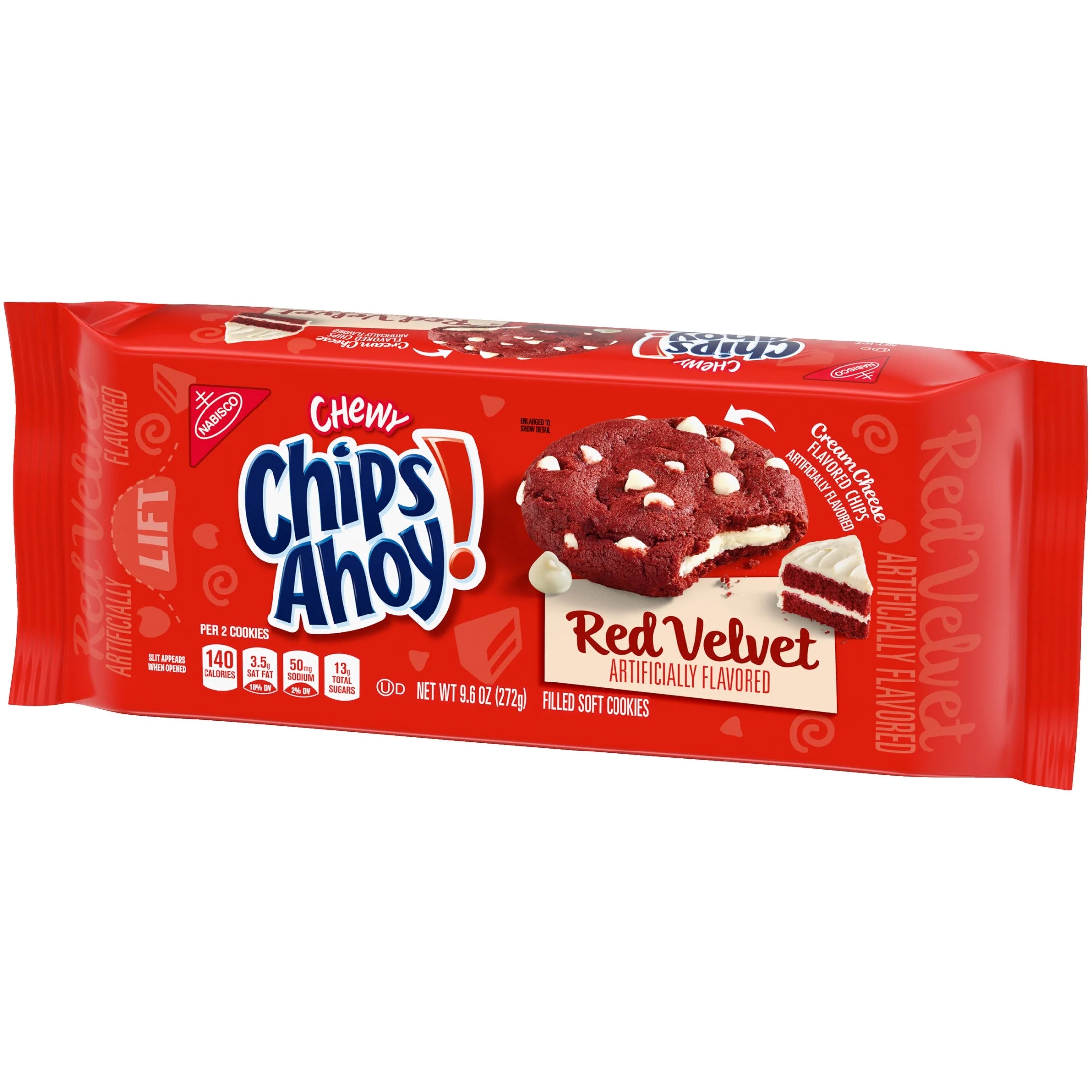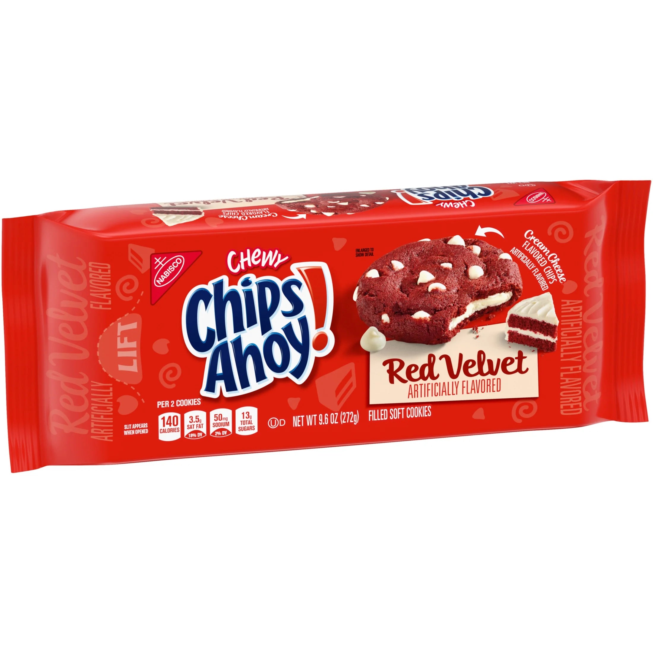 CHIPS AHOY! Chewy Red Velvet Cookies are Red Velvet flavored filled soft cookies with cream cheese flavored chips. These soft cookies are baked to perfection for maximum chewy goodness. Enjoy the indulgent taste of these red velvet cookies as a lunch snack, ice cream topper, or simple dessert. The lift tab makes this package of soft baked cookies easy to open and close for convenient storage.