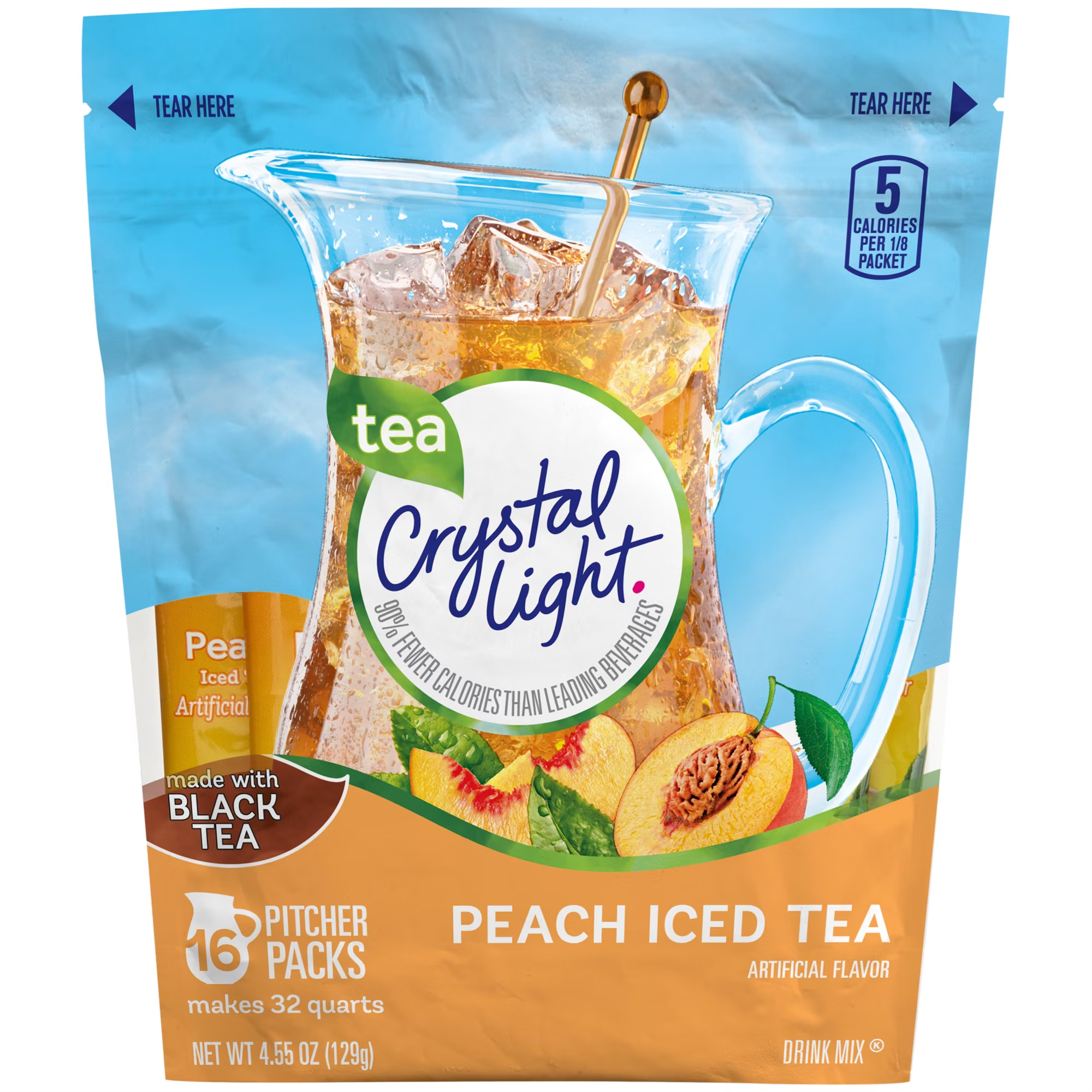Crystal Light Peach Iced Tea Powdered Drink Mix is a refreshing beverage you can enjoy at any time of day. With zero grams of sugar and only five calories per serving, Crystal Light Peach Tea powdered drink mix is a sweet alternative to juice and soda, with 90% fewer calories than leading beverages. It's also made with real black tea for a refreshingly smooth taste. Each packet of powdered iced tea mix in this 16 pack is perfectly portioned to make two quarts or one pitcher of Crystal Light, so there's plenty to share with family and friends. Simply mix one iced tea packet with eight cups of water, stir, and enjoy.