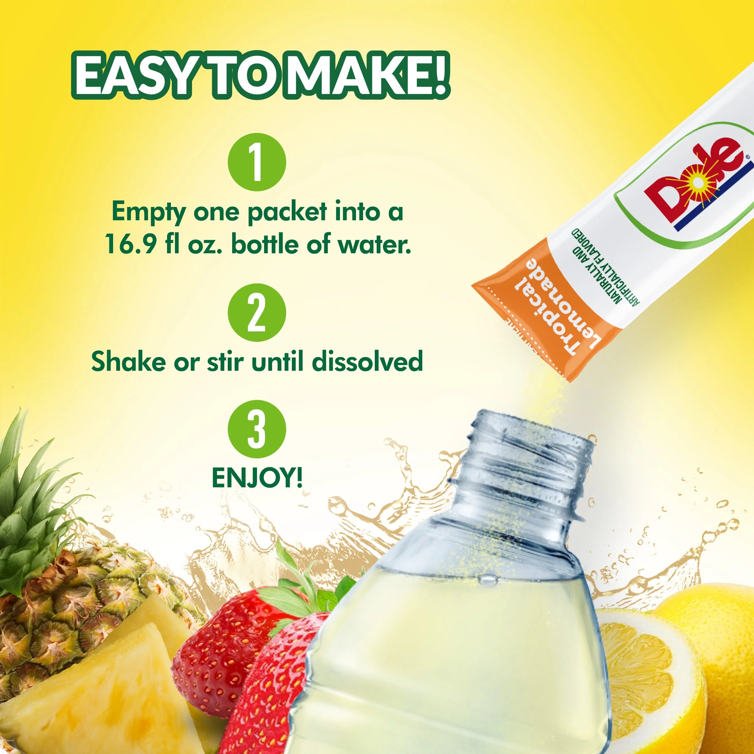 Dole’s fresh and exotic fruit flavors can go with you everywhere in an easy on-the-go packet! Bursting with sweet lemonade taste, zero sugar, and no synthetic dyes, Dole’s Lemonade drink mix elevates your hydration enjoyment and brings a refreshing splash of fruit flavor to every sip.