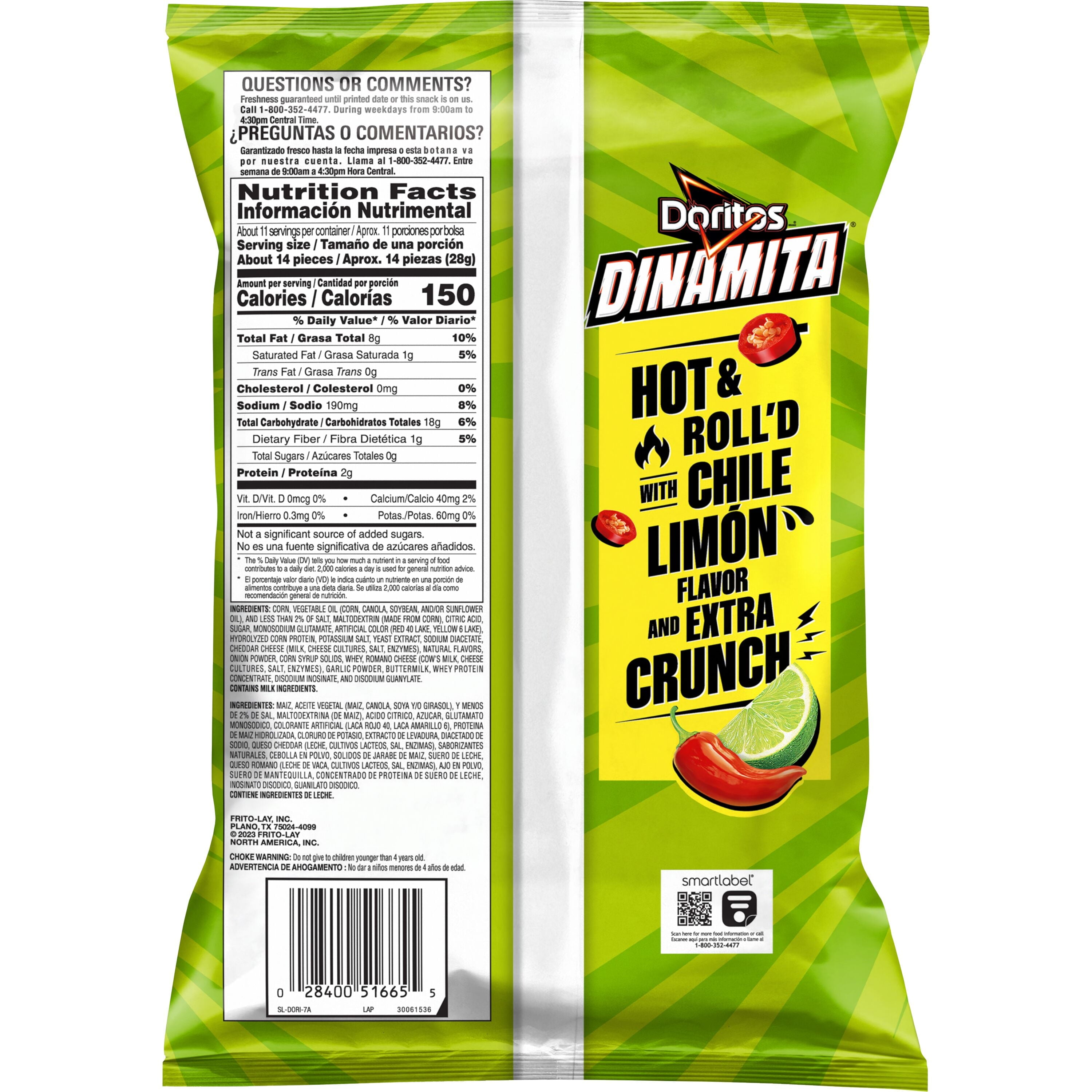 Doritos Dinamita Tortilla Chips Chile Limon (10.75 oz) deliver an explosive flavor experience! These rolled tortilla chips pack a spicy punch with zesty lime and chili seasoning, creating a bold and tangy taste sensation. Their unique shape offers a satisfying crunch that's perfect for dipping or enjoying straight from the bag. Ideal for snacking at parties, movie nights, or whenever you crave something bold, these chips are sure to elevate your snack game!