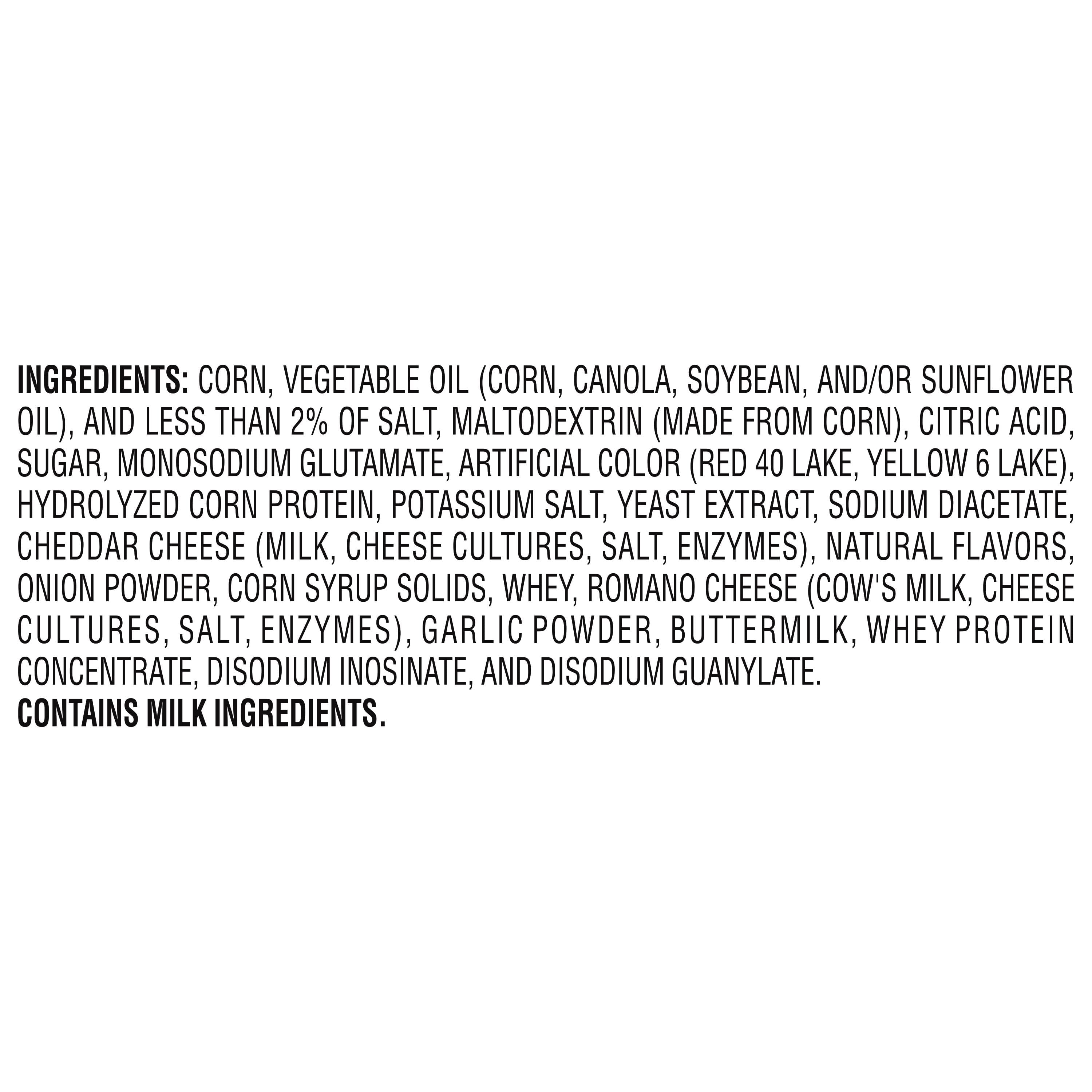 Corn, Vegetable Oil (Corn, Canola, and/or Sunflower Oil), 2% or less of the following: Maltodextrin (made from Corn), Salt, Citric Acid, Sugar, Monosodium Glutamate, Artificial Color (Red 40 Lake, Yellow 6 Lake), Hydrolyzed Corn Gluten, Yeast Extract, Sodium Diacetate, Cheddar Cheese (Milk, Cheese Cultures, Salt, Enzymes), Modified Corn Starch, Natural Flavor, Onion Powder, Whey, Corn Syrup Solids, Garlic Powder, Romano Cheese (Part-Skim Cow's Milk, Cheese Cultures, Salt, Enzymes) Buttermilk, Whey Protein Concentrate, Disodium Inosinate, and Disodium Guanylate/div>