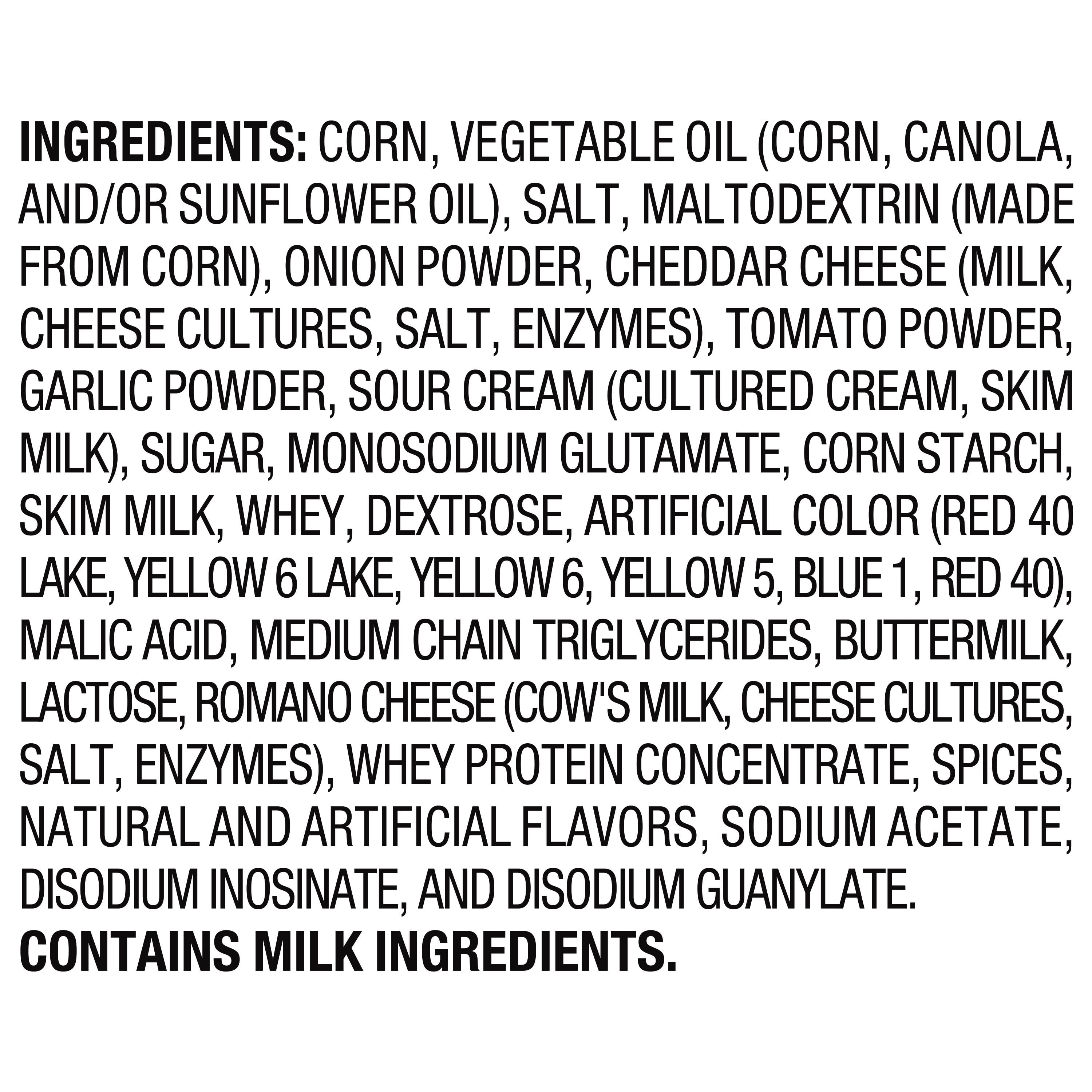 Corn, Vegetable Oil (Corn, Canola, And/Or Sunflower Oil), And Less Than 2% Of Salt, Maltodextrin (Made From Corn), Onion Powder, Cheddar Cheese (Milk, Cheese Cultures, Salt, Enzymes), Tomato Powder, Garlic Powder, Sour Cream (Cultured Cream, Skim Milk), Sugar, Monosodium Glutamate, Corn Starch, Skim Milk, Whey, Dextrose, Malic Acid, Medium Chain Triglycerides, Buttermilk, Lactose, Artificial Color (Red 40 Lake, Yellow 6 Lake, Yellow 6, Yellow 5, Blue 1, Red 40), Romano Cheese (Cow's Milk, Cheese Cultures, Salt, Enzymes), Whey Protein Concentrate, Spices, Natural And Artificial Flavors, Sodium Acetate, Disodium Inosinate, And Disodium Guanylate. CONTAINS MILK INGREDIENTS./div>