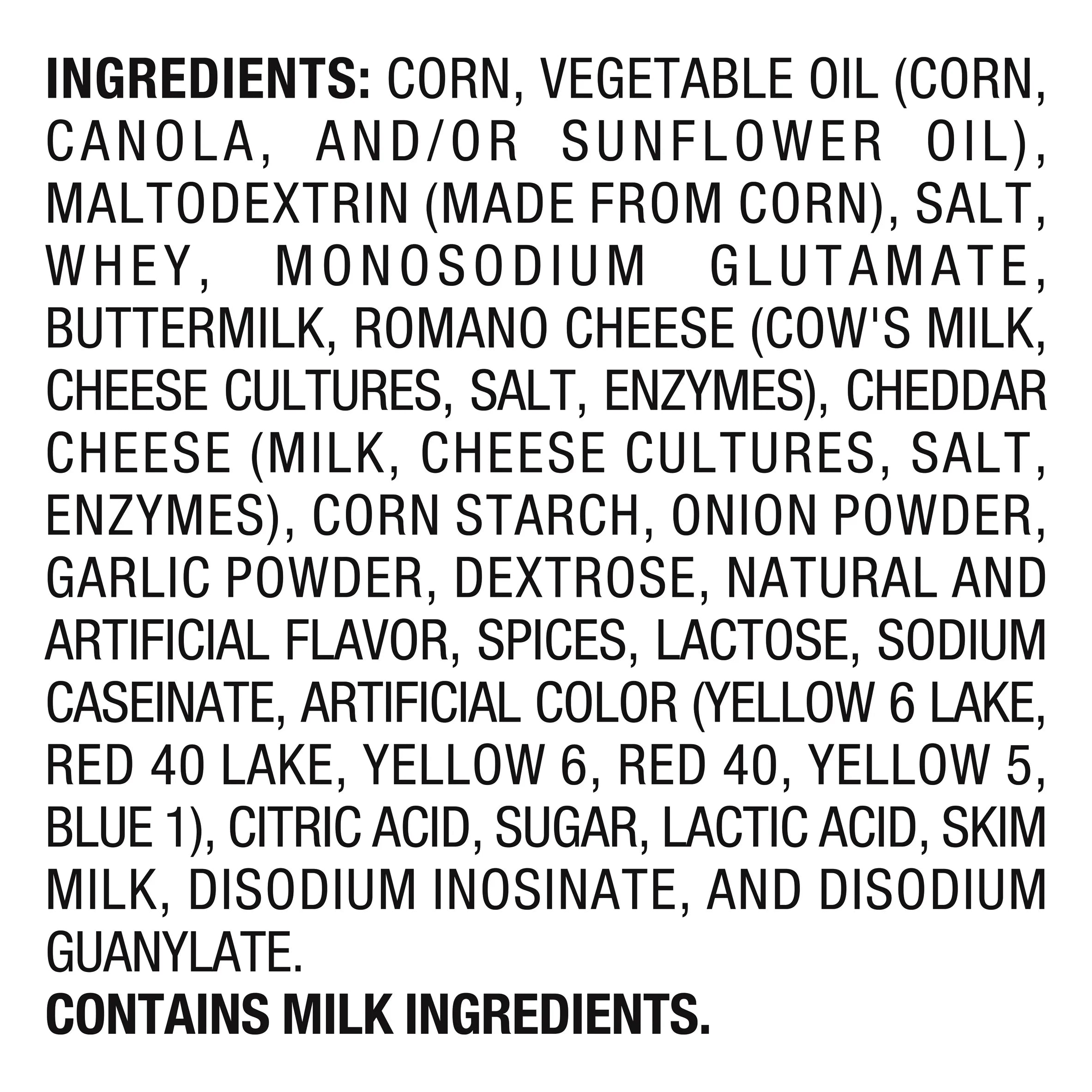Corn, Vegetable Oil (Corn, Canola, and/or Sunflower Oil), Maltodextrin (made from Corn), Salt, Whey, Monosodium Glutamate, Buttermilk, Romano Cheese (Cow's Milk, Cheese Cultures, Salt, Enzymes), Cheddar Cheese (Milk, Cheese Cultures, Salt, Enzymes), Corn Starch, Onion Powder, Garlic Powder, Dextrose, Natural and Artificial Flavor, Spices, Lactose, Sodium Caseinate, Artificial Color (Yellow 6 Lake, Red 40 Lake, Yellow 6, Red 40, Yellow 5, Blue 1), Citric Acid, Sugar, Lactic Acid, Skim Milk, Disodium Inosinate, Disodium Guanylate/div>