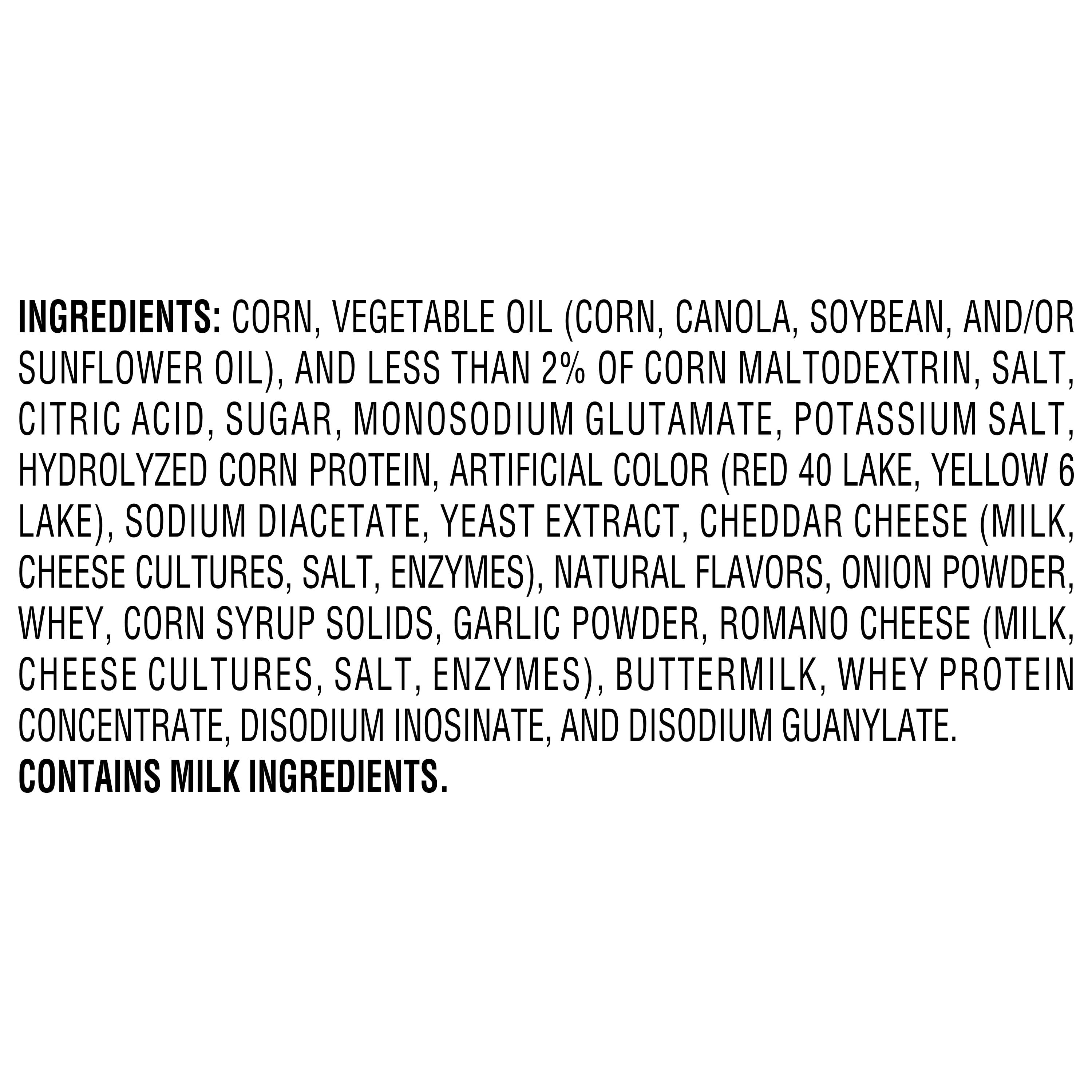 Corn, Vegetable Oil (Corn, Canola, Soybean, and/or Sunflower Oil), and Less than 2% of Corn Maltodextrin, Salt, Citric Acid, Sugar, Monosodium Glutamate, Potassium Salt, Hydrolyzed Corn Protein, Artificial Color (Red 40 Lake, Yellow 6 Lake), Sodium Diacetate, Yeast Extract, Cheddar Cheese (Milk, Cheese Cultures, Salt, Enzymes), Natural Flavors, Onion Powder, Whey, Corn Syrup Solids, Garlic Powder, Romano Cheese (Milk Cheese Cultures, Salt, Enzymes), Buttermilk, Whey Protein Concentrate, Disodium Inosinate, and Disodium Guanylate./div>