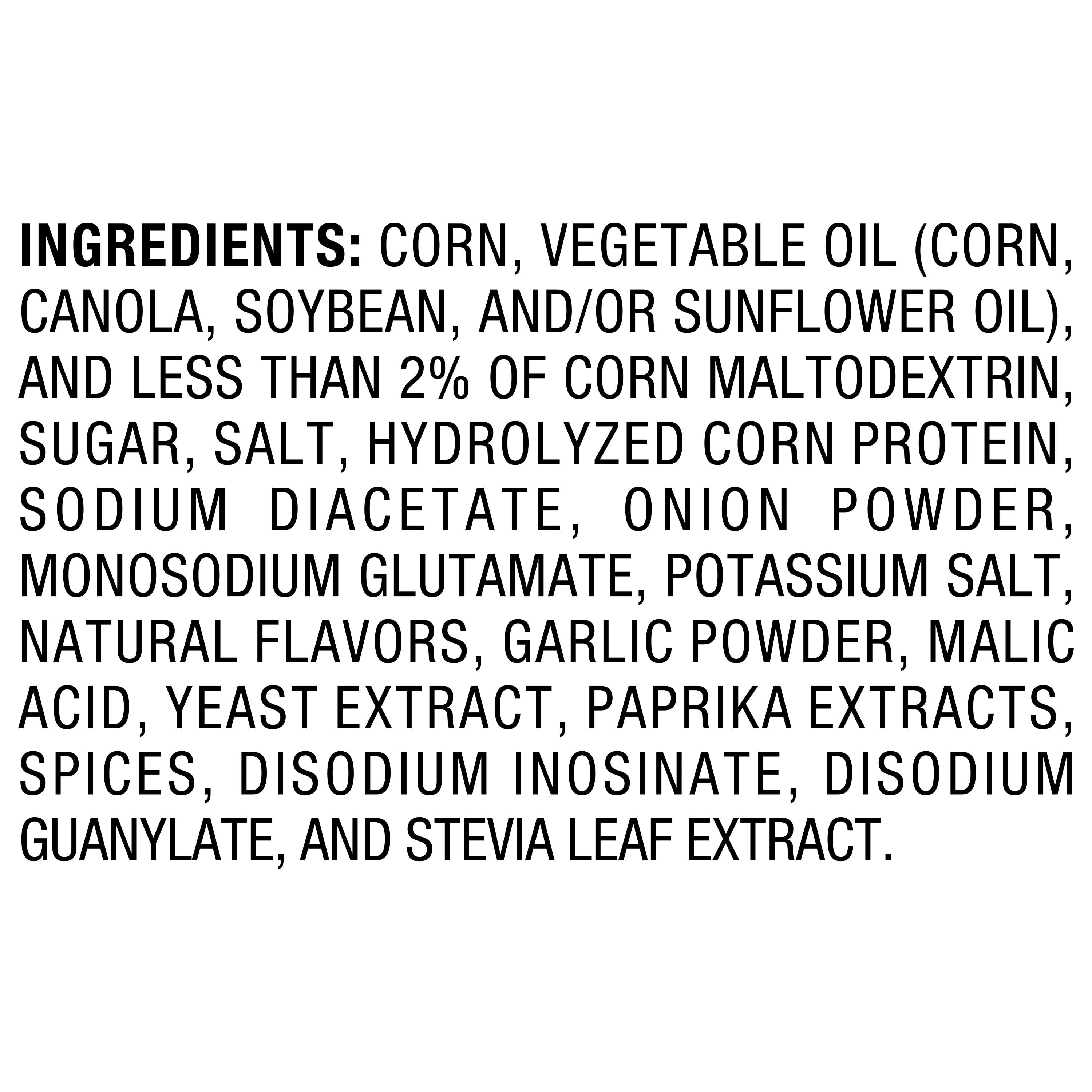 Corn, Vegetable Oil (Corn, Canola, and/or Sunflower Oil), Salt, Sugar, Monosodium Glutamate, Fructose, Sodium Diacetate, Soy Sauce (Soybean, Wheat, Salt), Onion Powder, Maltodextrin (made from Corn), Hydrolyzed Soy Protein, Hydrolyzed Corn Protein, Garlic Powder, Torula Yeast, Malic Acid, Extractives of Paprika, Spices, Caramel Color, Disodium Inosinate, Disodium Guanylate, Dextrose, Natural Flavor/div>