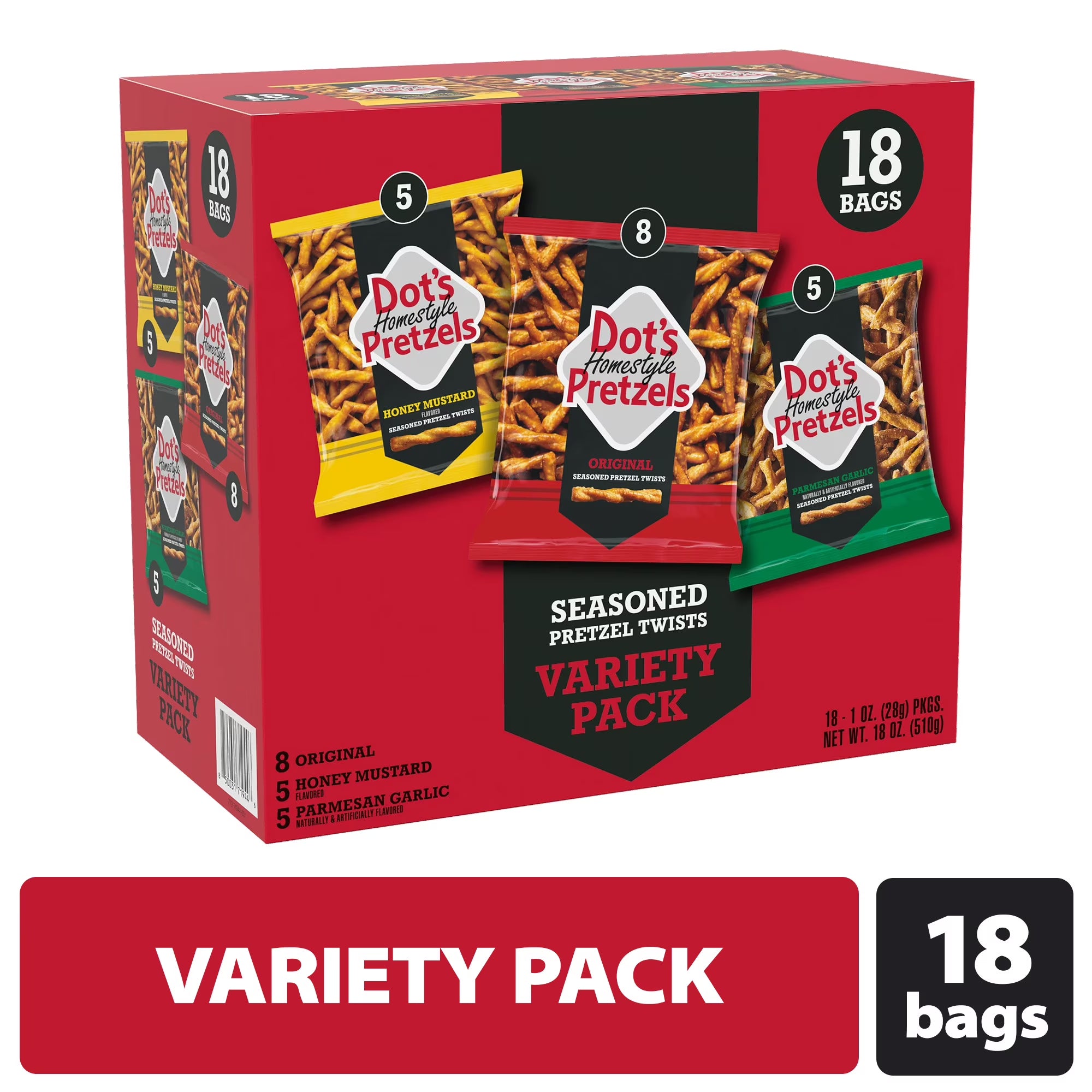 - Variety pack includes 18 1-ounce single-serve bags—8 Original Pretzels, 5 Honey Mustard Pretzels, and 5 Parmesan Garlic Pretzels
