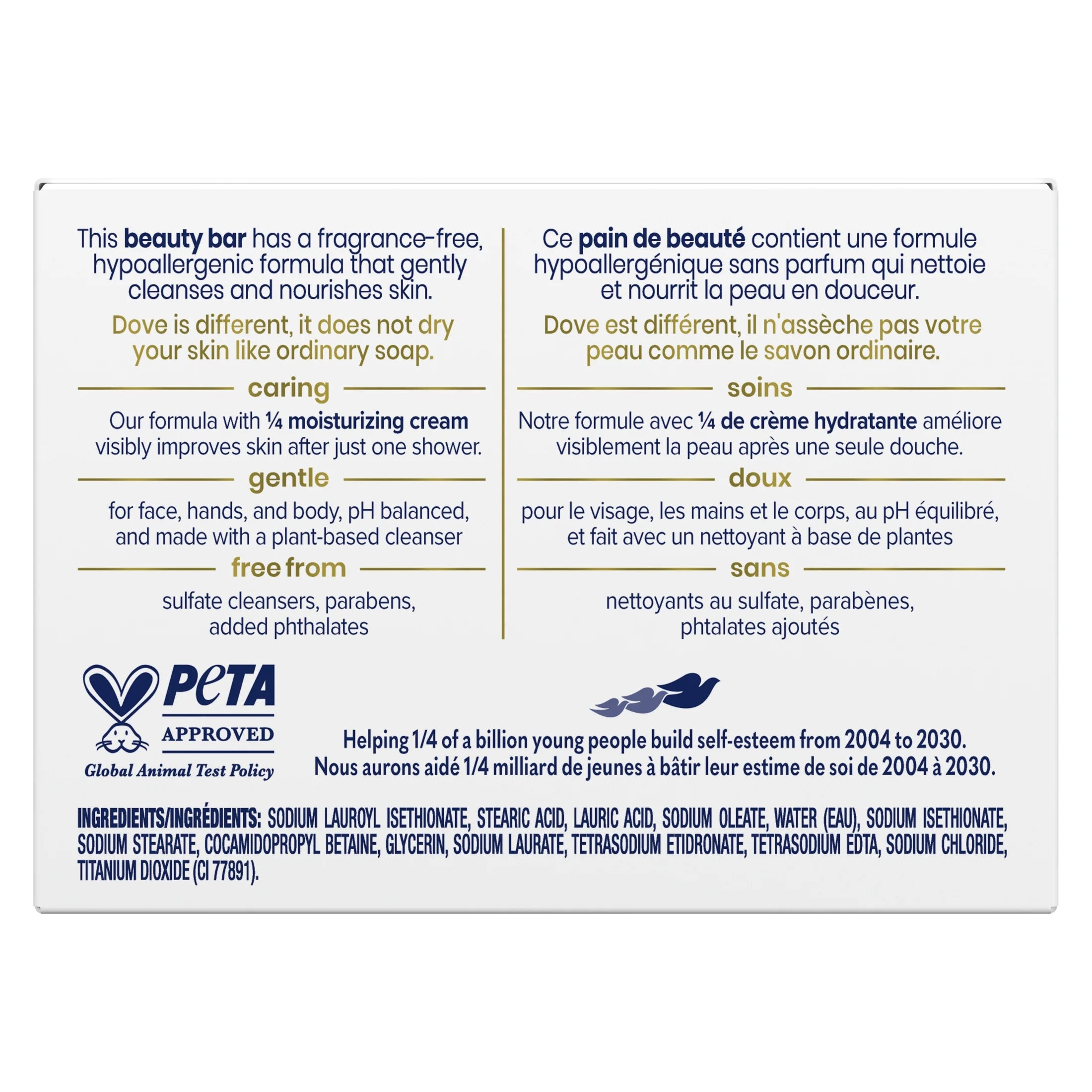 Dove Beauty Bar Soap for Women Sensitive Skin Fragrance Free and Hypoallergenic, 2.6 oz. This Dove Beauty Bar offers a gentle & fragrance free cleansing experience. Unlike ordinary bar soap, the Dove Beauty Bar is made with moisturizing cream to deeply nourish skin and help prevent dryness. This cleansing bar is uniquely created with moisturizing cream and a plant-based cleanser for skin care that maintains pH balance and the natural skin barrier. This gentle skin cleanser is multi-purpose: gently washing away dirt and oil while moisturizing and nourishing the skin. It is gentle enough for use on face, hands, and body, as a facial cleanser and body soap bar. For adult use.