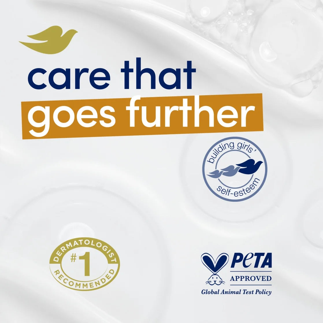 - CARE WITH YOUR CLEANSER: Globally, Dove does not test on animals and is PETA Approved; Our mission is to help the next generation of women develop a positive relationship with the way they look, helping them raise their self-esteem
