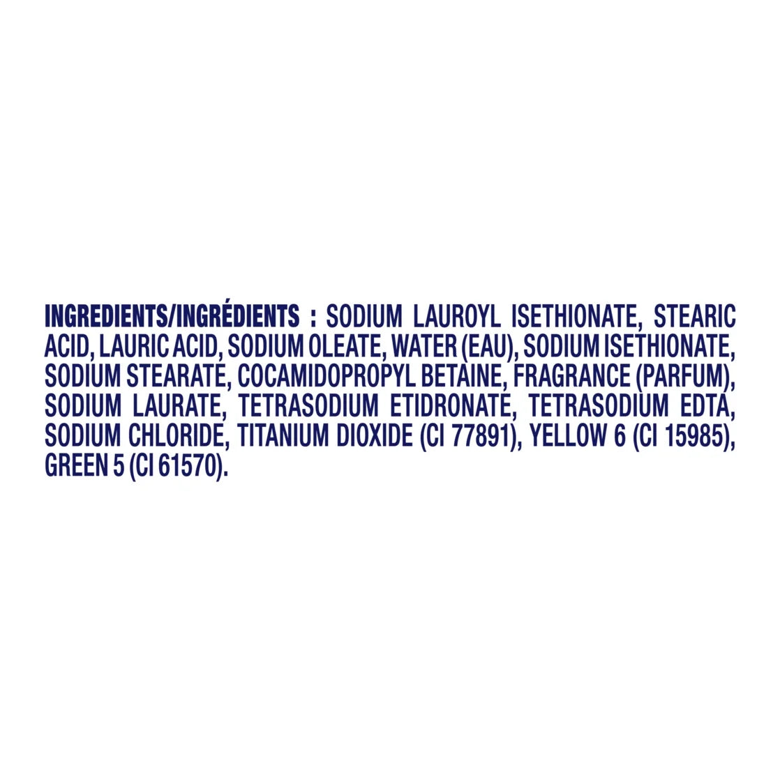 SODIUM LAUROYL ISETHIONATE, STEARIC ACID, LAURIC ACID, SODIUM OLEATE, WATER (EAU), SODIUM ISETHIONATE, SODIUM STEARATE, COCAMIDOPROPYL BETAINE, FRAGRANCE (PARFUM), SODIUM LAURATE, SODIUM CHLORIDE, TETRASODIUM ETIDRONATE, TETRASODIUM EDTA, KAOLIN OR (OU), TITANIUM DOIXIDE, GREEN 5 (CI 61570), YELLOW 6 (CI 15985)./div>