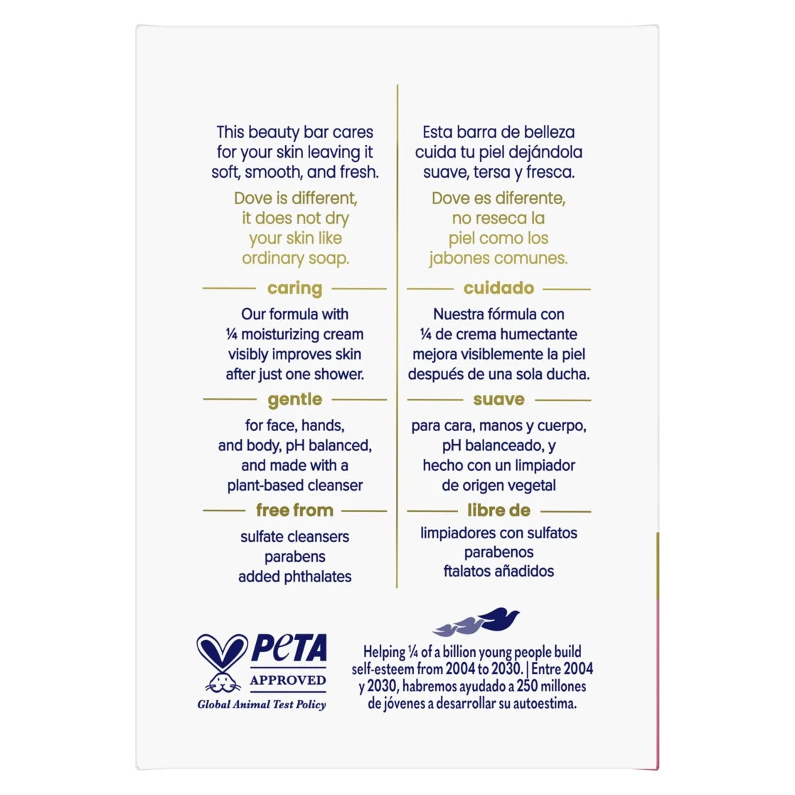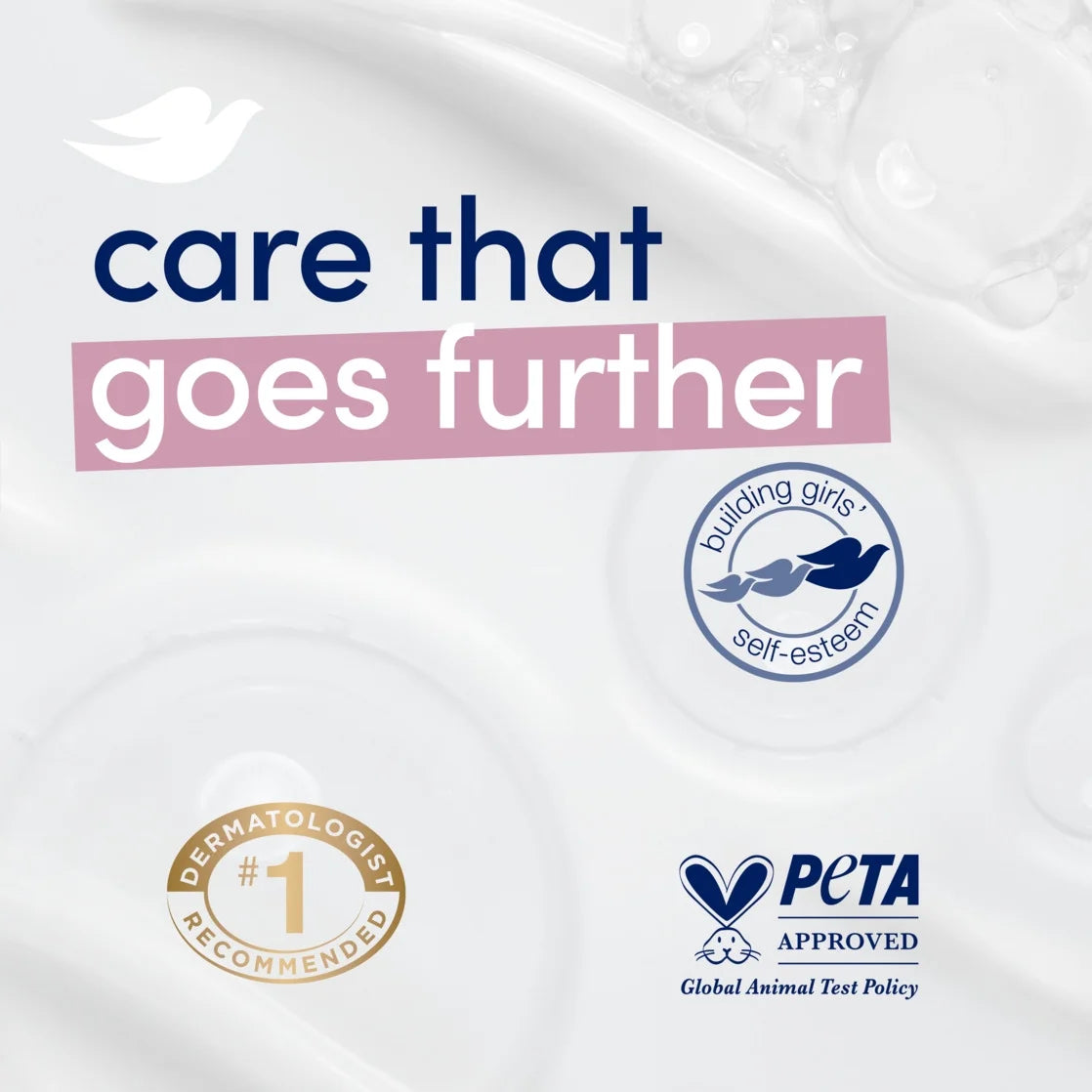 - CARE WITH YOUR CLEANSER: Globally, Dove does not test on animals and is PETA Approved; Our mission is to help the next generation of women develop a positive relationship with the way they look, helping them raise their self-esteem