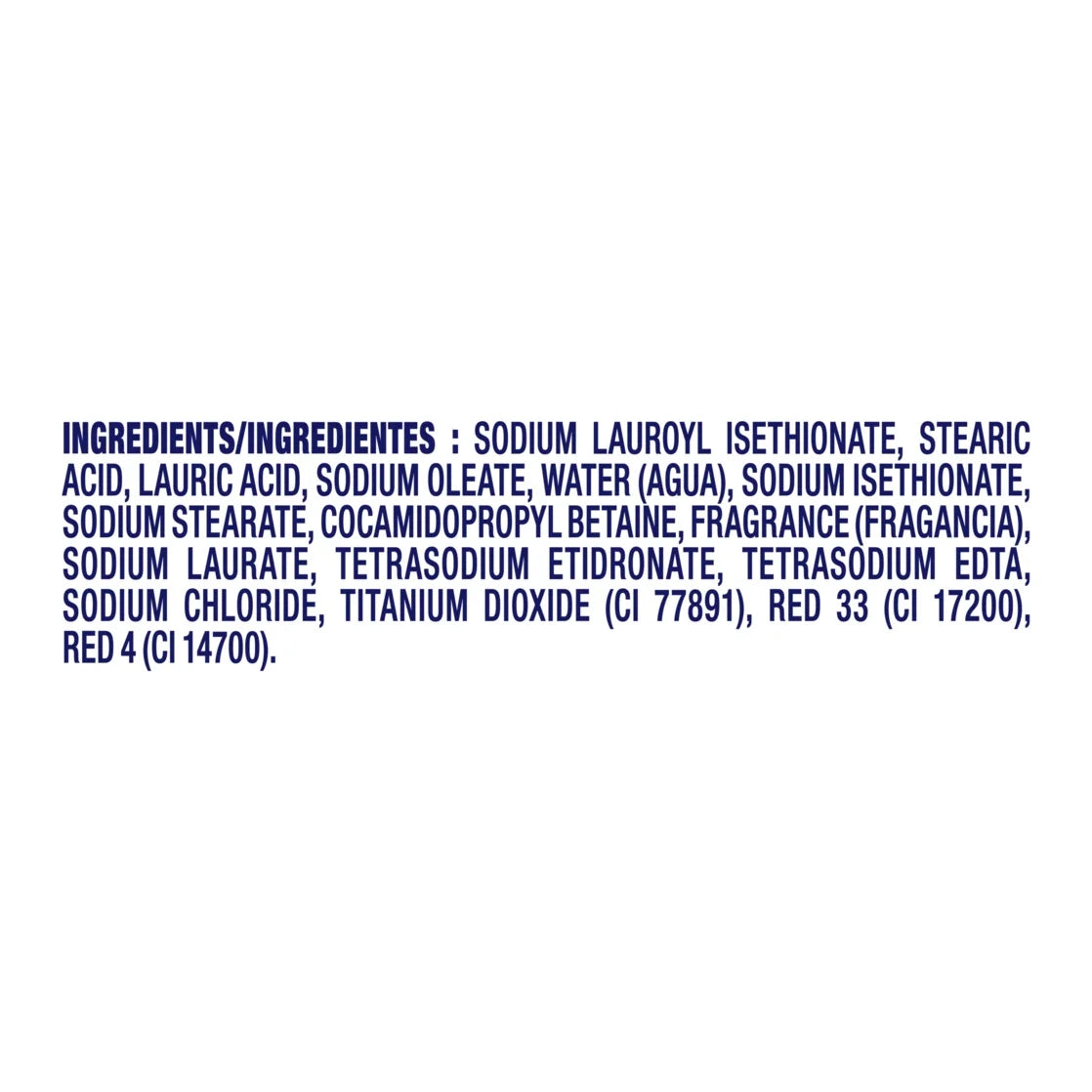 Sodium Lauroyl Isethionate, Stearic Acid, Lauric Acid, Sodium Tallowate or Sodium Palmitate, Water (Aqua), Sodium Isethionate, Sodium Stearate, Cocamidopropyl Betaine, Sodium Cocoate or Sodium Palm Kernelate, Fragrance/Fragrancia, Sodium Chloride, Tetrasodium Etidronate, Tetrasodium EDTA, Titanium Dioxide (CI 77891), Red 4 (CI 14700), Red 33 (CI17200)/div>