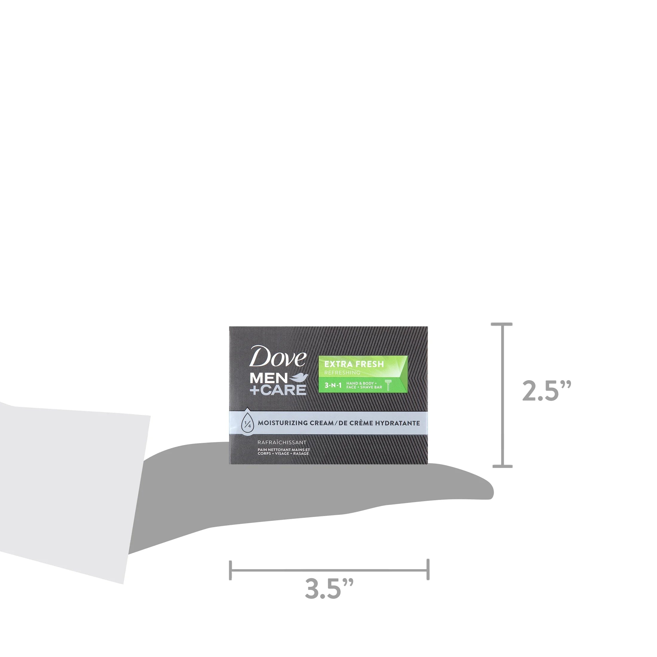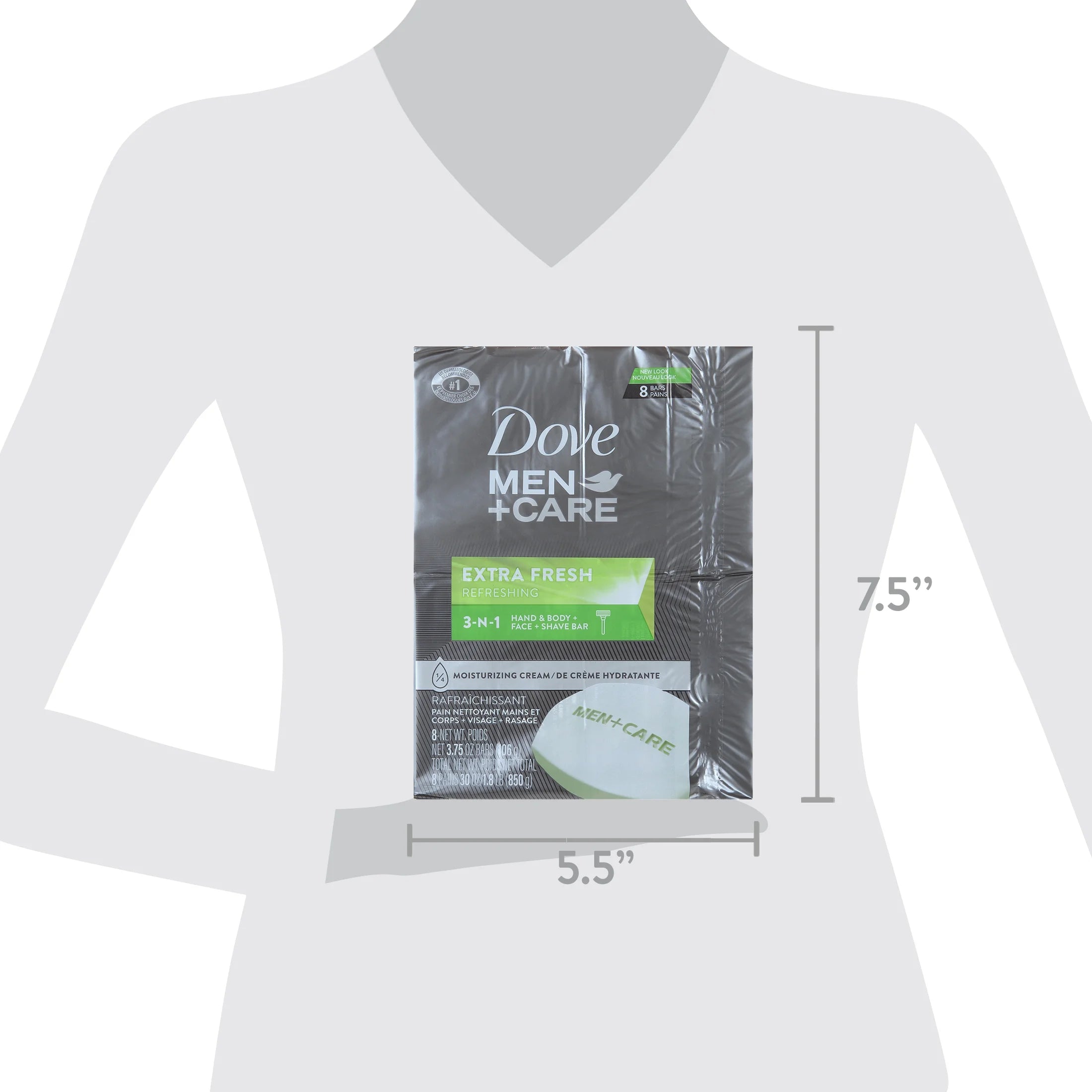 Dove Men+Care Extra Fresh Body and Face Bar, 4 oz, 8 Bar. Looking for a bar that leaves skin feeling refreshed, hydrated, and invigorated? Dove Men+Care Extra Fresh Body and Face Bar delivers a deep, refreshing clean and hydration. Unlike ordinary men's bar soap or body soap that can dry out skin, this bar is formulated with more moisturizer to help maintain skin’s moisture and hydration levels, leaving it feeling healthy, smooth and comfortable.From the dermatologist recommended men’s brand, Dove Men+Care Extra Fresh Body and Face Bar is specifically designed for men to give skin a deep clean, while leaving it hydrated and healthy. This 3 in 1 bar is gentle enough to be used not only for the body, but also as a facial cleanser and shaving product. To use, moisten the body bar with water and work it into a light foam between your hands. Massage onto your face and body before rinsing thoroughly.Dove Men+Care is committed to expanding opportunities for men to experience the transformative effects of care on themselves and others. As part of this, we are championing active fatherhood and paternity leave for dads everywhere, so that more dads can be there from day one. Because when men care, everyone benefits.And as part of our commitment towards sustainability, each Dove Men+Care body and face wash bar is PETA certified Cruelty Free. For adult use.