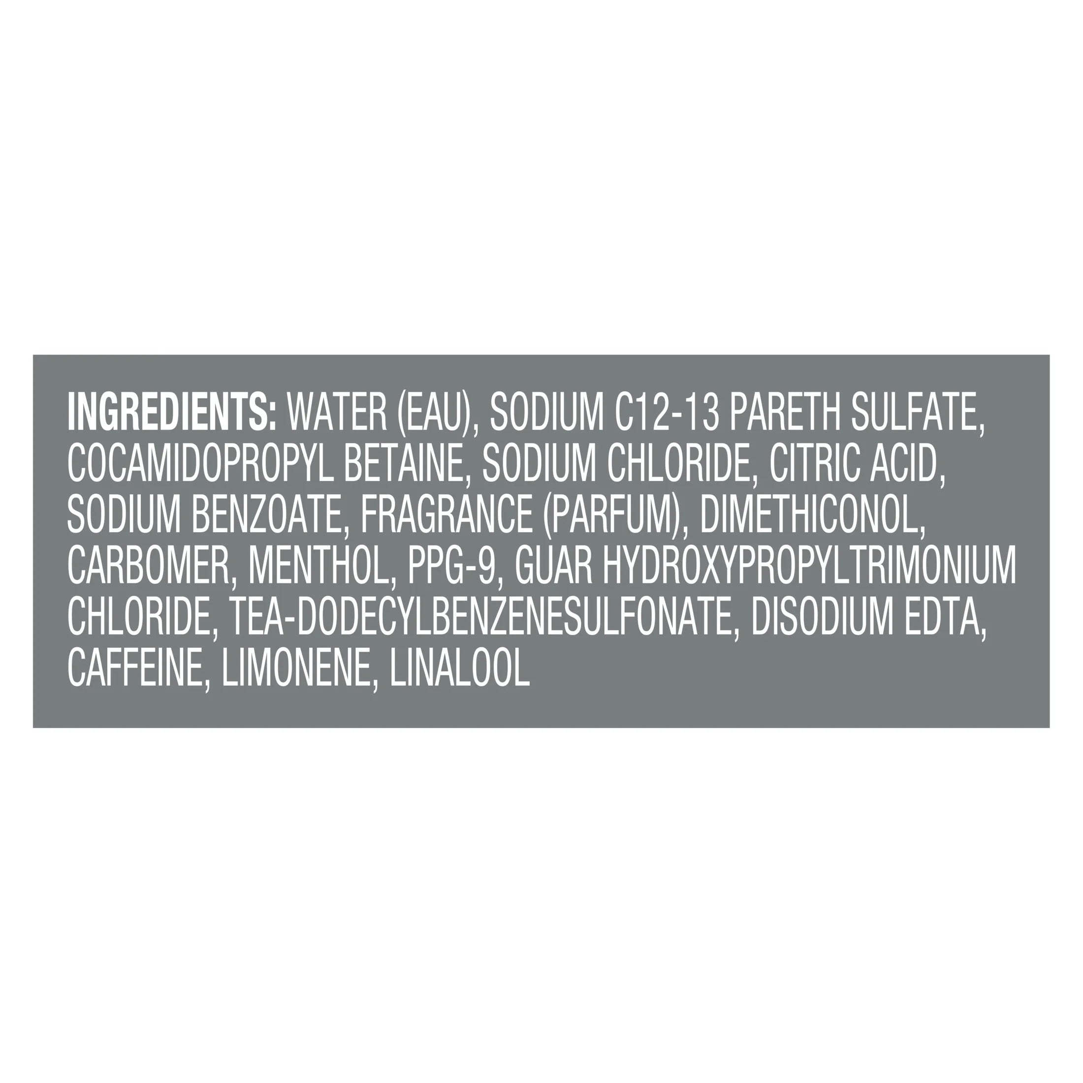 Water (Eau), Sodium C12-13 Pareth Sulfate, Cocamidopropyl Betaine, Sodium Chloride, Citric Acid, Sodium Benzoate, Fragrance (Parfum), Dimethiconol, Carbomer, Menthol, PPG-9, Guar Hydroxypropyltrimonium Chloride, TEA-Dodecylbenzenesulfonate, Disodium EDTA, Caffeine, Limonene, Linalool/div>