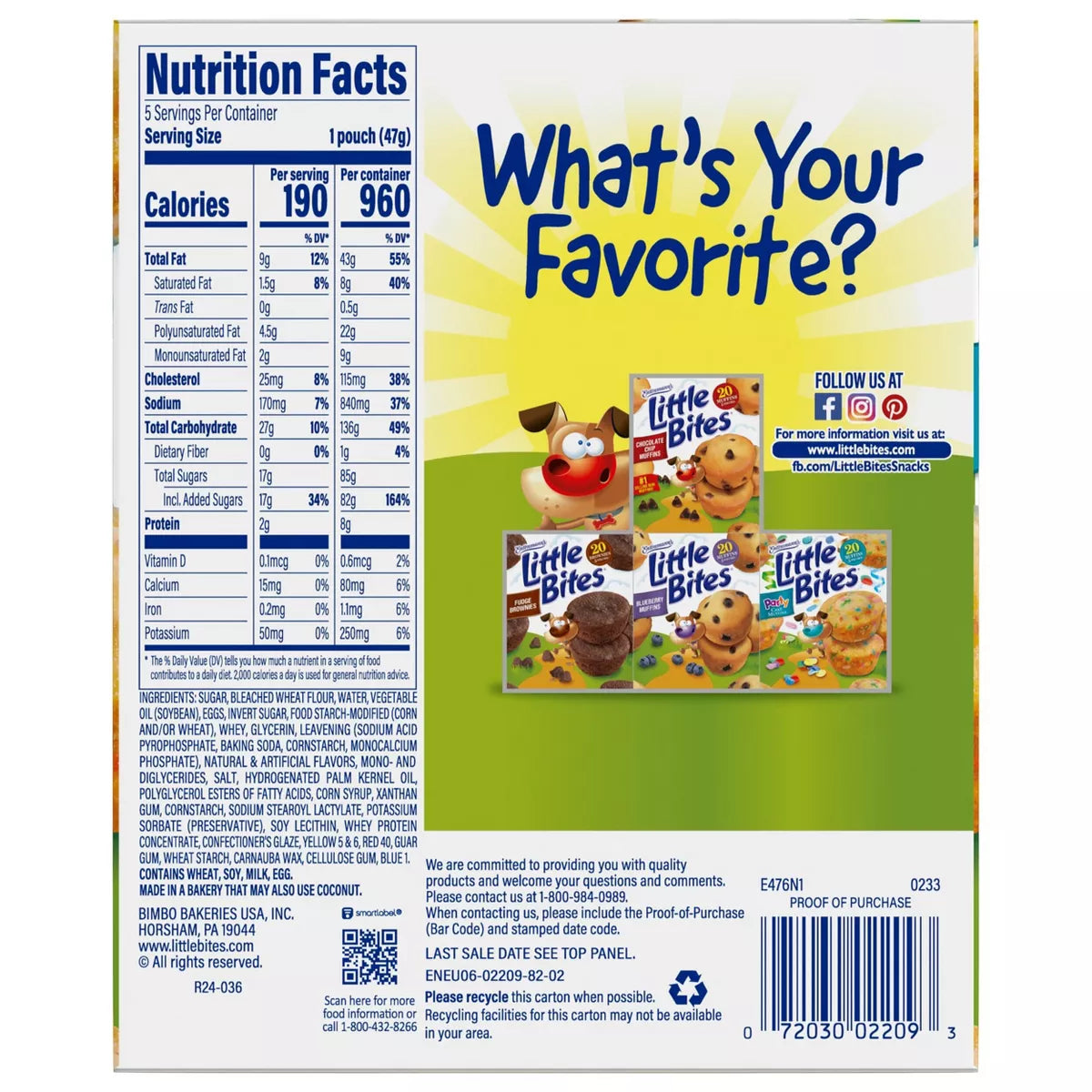Little Bites Party Cake Mini Muffins are a moist baked snack with a festival flavor for a taste kids will love. With no high fructose corn syrup and 0 grams of trans fat per serving, you can feel good about enjoying these bakery mini muffins with your kids. These pre-portioned mini muffins come in convenient pouches, making them ideal school snacks, lunch snacks and on the go snacks for busy families.