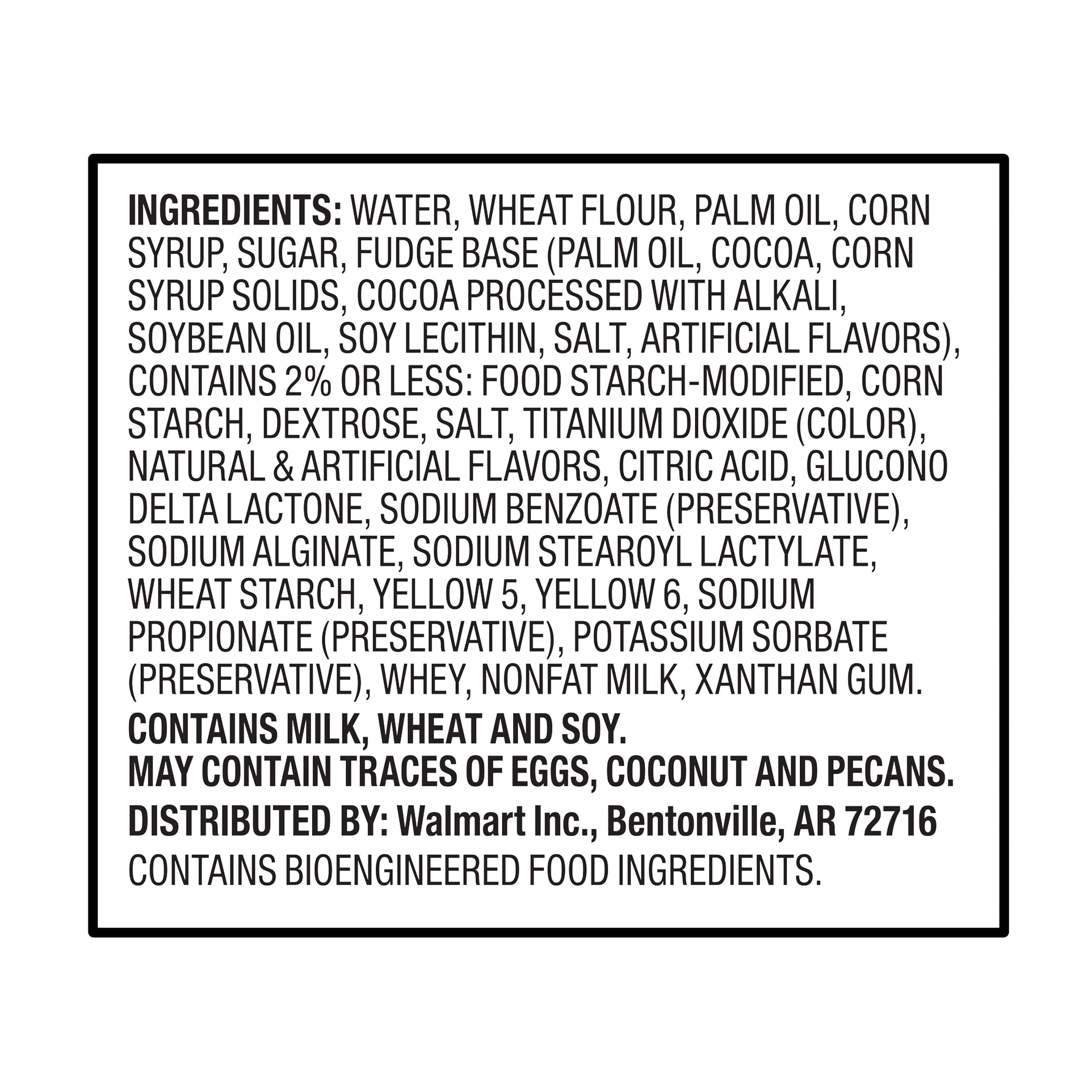 INGREDIENTS: Water, Wheat Flour, Palm Oil, Corn Syrup, Sugar, Fudge Base (Palm Oil, Cocoa, Corn Syrup Solids, Cocoa Processed with Alkali, Soybean Oil, Soy Lecithin, Salt, Artificial Flavors), Contains 2% or less: Food Starch-Modified, Corn Starch, Dextrose, Salt, Titanium Dioxide (color), Natural & Artificial Flavors, Citric Acid, Glucono Delta Lactone, Sodium Benzoate (preservative), Sodium Alginate, Sodium Stearoyl Lactylate, Wheat Starch, Yellow 5, Yellow 6, Sodium Propionate (preservative), Potassium Sorbate (preservative), Whey, Nonfat Milk, Xanthan Gum./div>