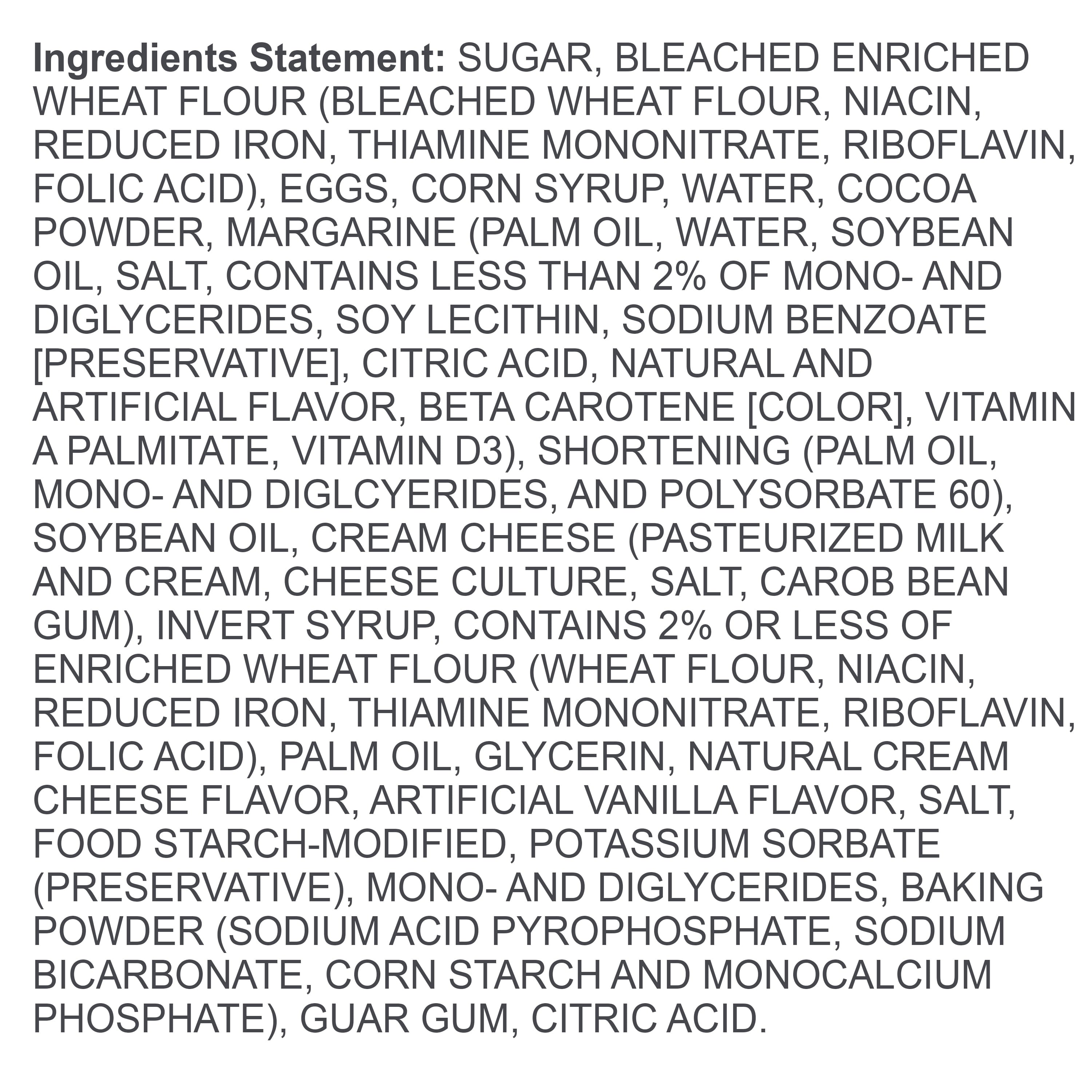 SUGAR, POWDERED SUGAR, BLEACHED ENRICHED WHEAT FLOUR (BLEACHED WHEAT FLOUR, NIACIN, REDUCED IRON, THIAMINE MONONITRATE, RIBOFLAVIN, FOLIC ACID), EGGS, CORN SYRUP, PALM OIL, COCOA POWDER, MARGARINE (PALM OIL, WATER, SOYBEAN OIL, SALT, CONTAINS LESS THAN 2% OF MONO- AND DIGLYCERIDES, SOY LECITHIN, SODIUM BENZOATE [PRESERVATIVE], CITRIC ACID, NATURAL AND ARTIFICIAL FLAVOR, BETA-CAROTENE [COLOR], VITAMIN A PALMITATE, VITAMIN D3), SOYBEAN OIL, CREAM CHEESE (PASTEURIZED MILK AND CREAM, CHEESE CULTURE, SALT, CAROB BEAN GUM), INVERT SYRUP, WATER, ENRICHED WHEAT FLOUR (WHEAT FLOUR, NIACIN, REDUCED IRON, THIAMINE MONONITRATE, RIBOFLAVIN, FOLIC ACID), GLYCERINE (VEGETABLE), FOOD STARCH-MODIFIED, MONO- AND DIGLYCERIDES, NATURAL AND ARTIFICIAL FLAVOR, SALT, POTASSIUM SORBATE (PRESERVATIVE), GUAR GUM, SODIUM ACID PYROPHOSPHATE, BAKING SODA, CORNSTARCH, POLYSORBATE 60, CITRIC ACID, MONOCALCIUM PHOSPHATE./div>