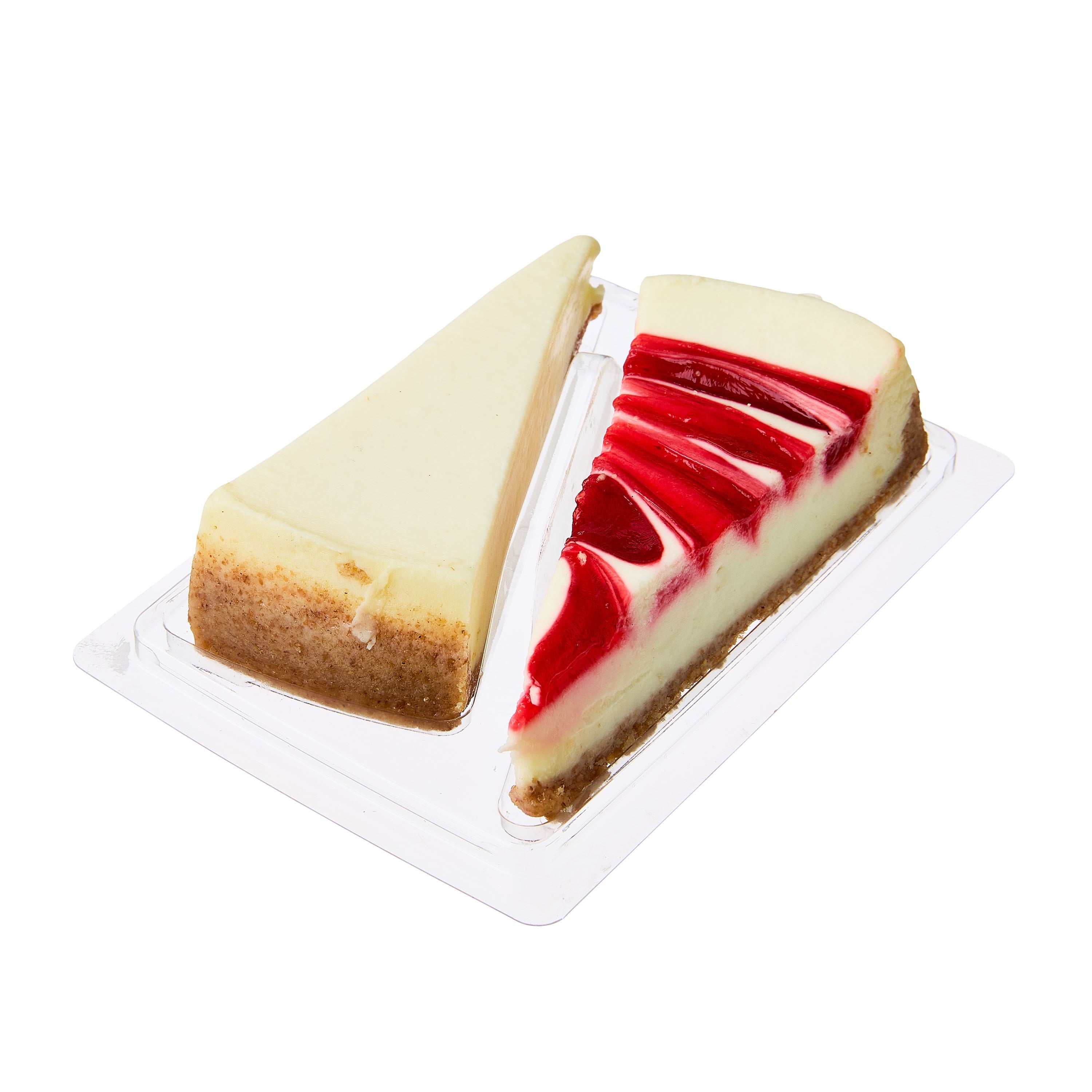 - Contains a single slice of both New York style and strawberry swirl cheesecake