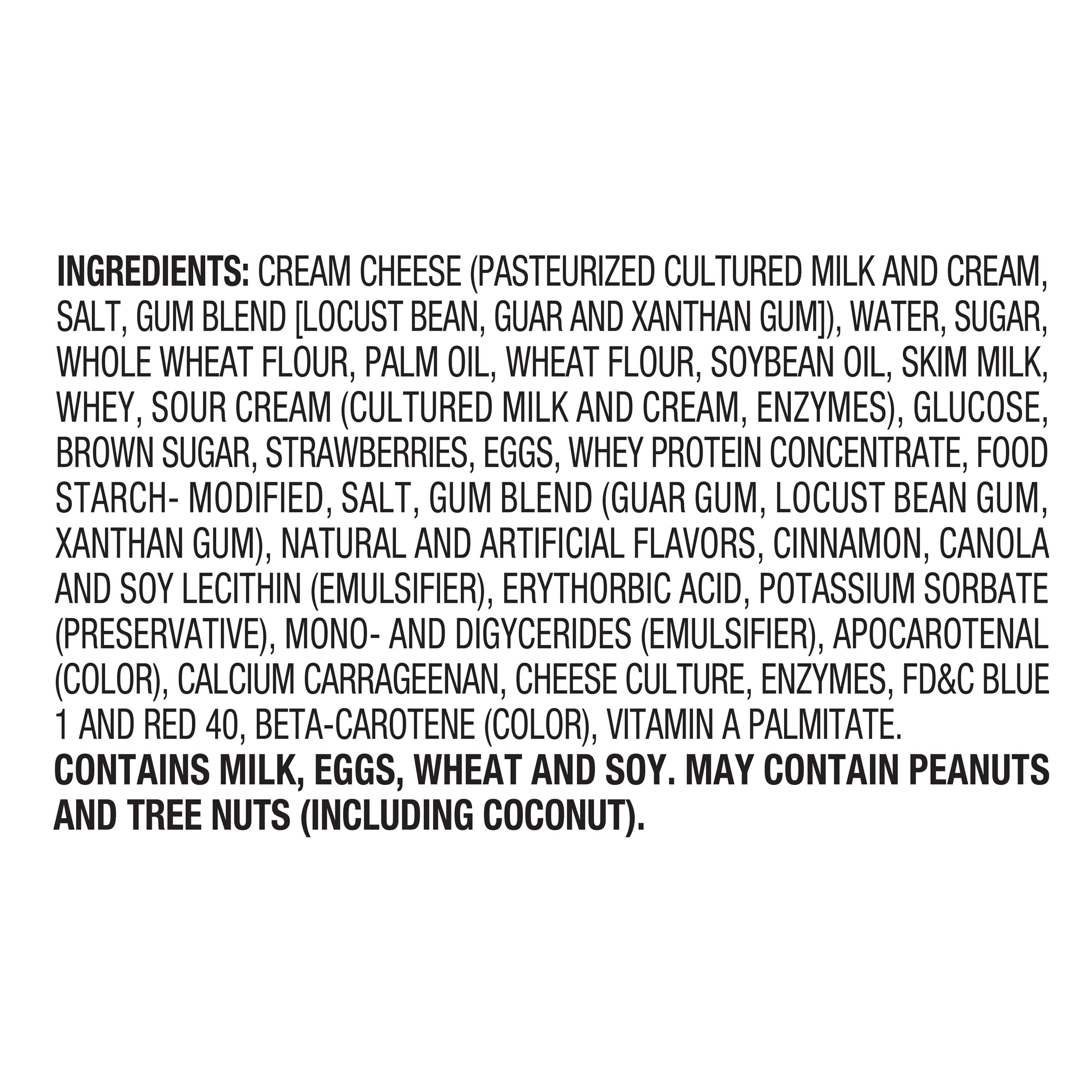 Cream Cheese (Milk, Cream, Cheese Culture, Salt, Carob Bean Gum), Sugar, Enriched Unbleached Wheat Flour (Flour, Niacin, Reduced Iron, Thiamine, Mononitrate, Riboflavin, Folic Acid, Enzyme), Heavy Creamy (Cream, Milk, Carrageenan, Mono- And Diglycerides, Cellulose Gum, Polysorbate 80), Eggs, Sour Cream (Cultured Pasteurized Milk, Cream, Modified Cornstarch, Sodium Citrate, Carrageenan, Guar Gum, Locust Bean Gum), Strawberries, Butter (Cream, Salt), Skim Milk, Graham Flour, Palm Oil, Contains Less Than 2% of The Following: Brown Sugar, Honey, Modified Cornstarch, Palm Kernel Oil, Natural And Artificial Flavor, High Fructose Corn Syrup, Salt, Baking Soda, Coconut Oil, Soy Lecithin, to Preserve Freshness (Potassium Sorbate, Sodium Benzoate), Milk Solids, Citric Acid, Artificial Color (Red 40), Lemon Juice Concentrate, Natural Flavor, Lemon Oil. Allergy Warning: Milk, Wheat, Eggs, Soy May Contain Traces of Tree Nuts And Peanuts./div>