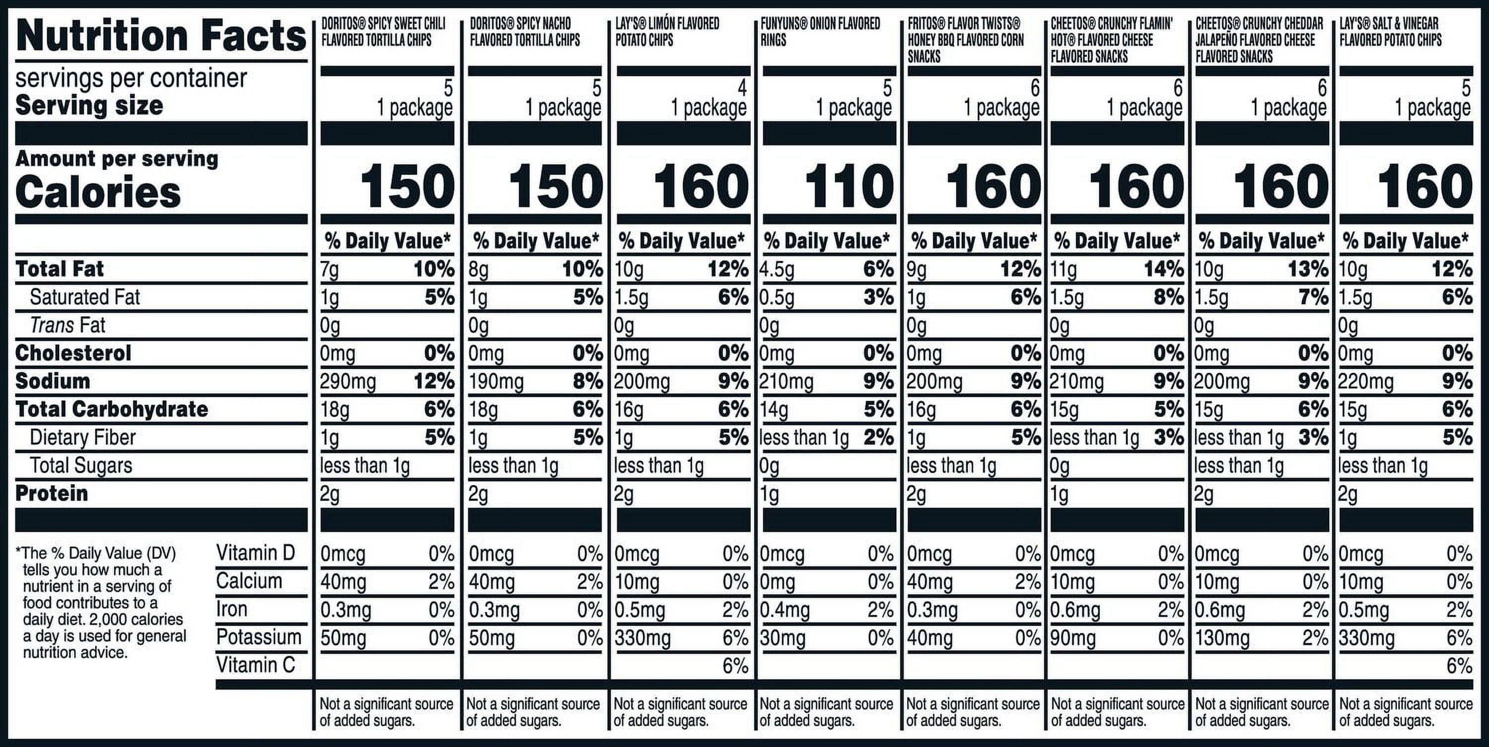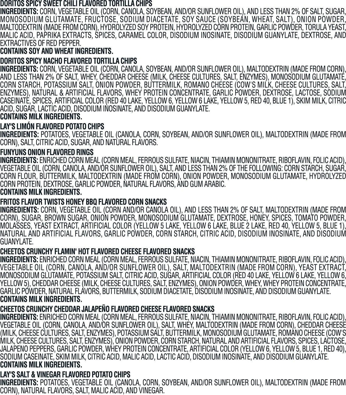 - Includes 5 Doritos Spicy Sweet Chili chips, 5 Doritos Spicy Nacho chips, 4 Lay's Limon potato chips, 5 Funyuns Onion Rings, 6 Fritos Honey BBQ Flavor Twists, 6 Cheetos Flamin' Hot Crunchy snacks, 6 Cheetos Cheddar Jalapeno snacks and 5 Lay's Salt and Vinegar potato chips