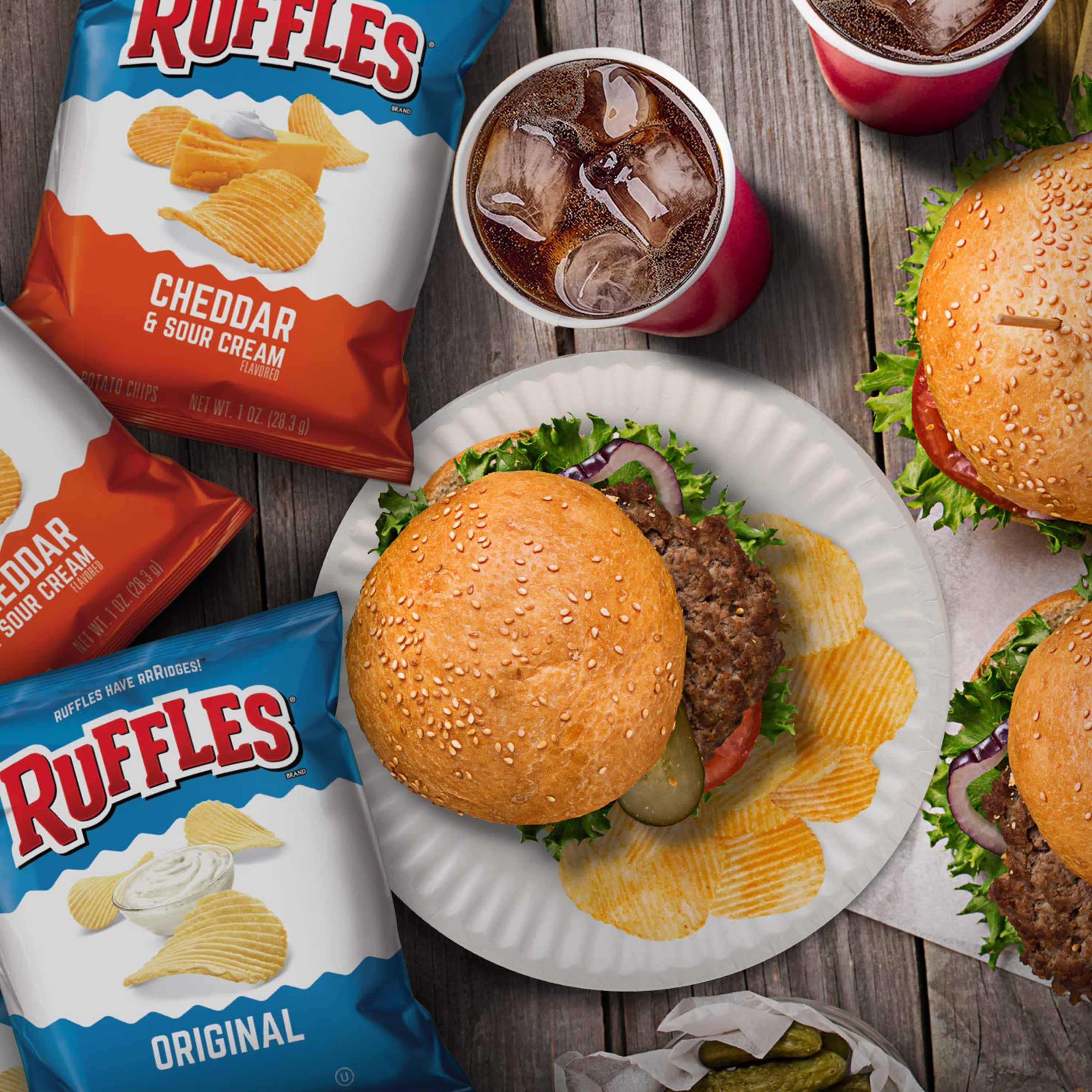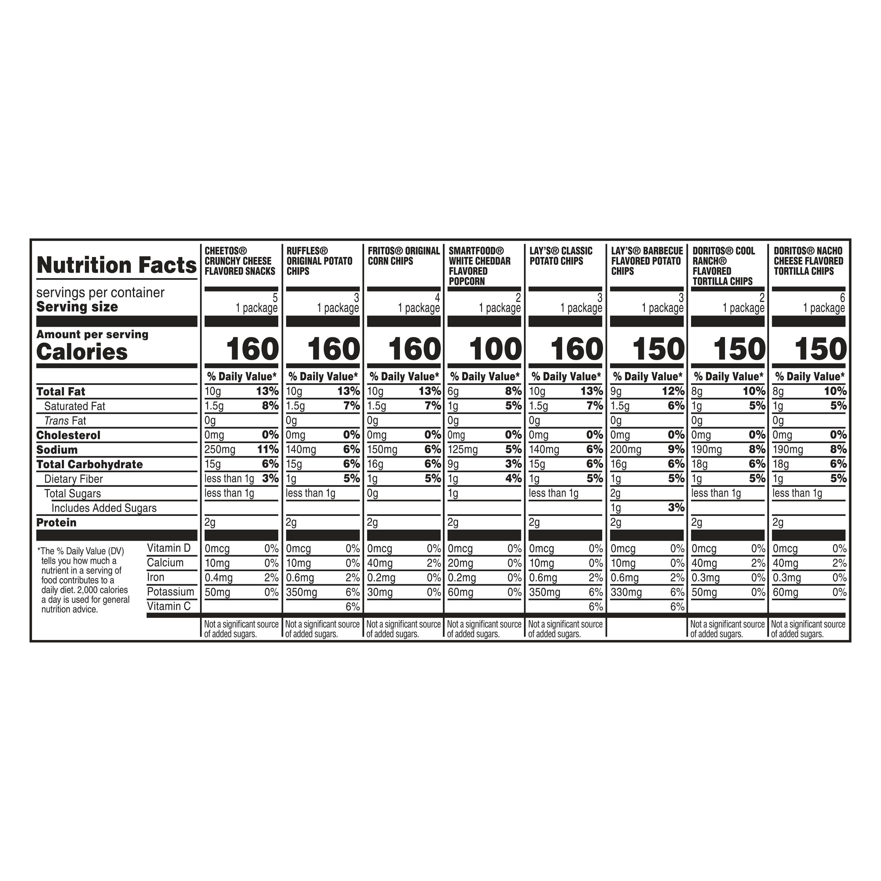 - Frito Lay Party Size Classic Mix Variety Pack includes 28 Single Serve Bags: 5 (1 oz) Cheetos Crunchy Cheese Flavored Snacks, 3 (1 oz) Ruffles Original Potato Chips, 4 (1 oz) Fritos Original Corn Chips, 2 (5/8 oz) Smartfood White Cheddar Flavored Popcorn, 3 (1 oz) Lay's Classic Potato Chips, 3 (1 oz) Lay's Barbecue Potato Chips, 2 (1 oz ) Doritos Cool Ranch Tortilla Chips, and 6 (1 oz) Doritos Nacho Cheese Tortilla Chips