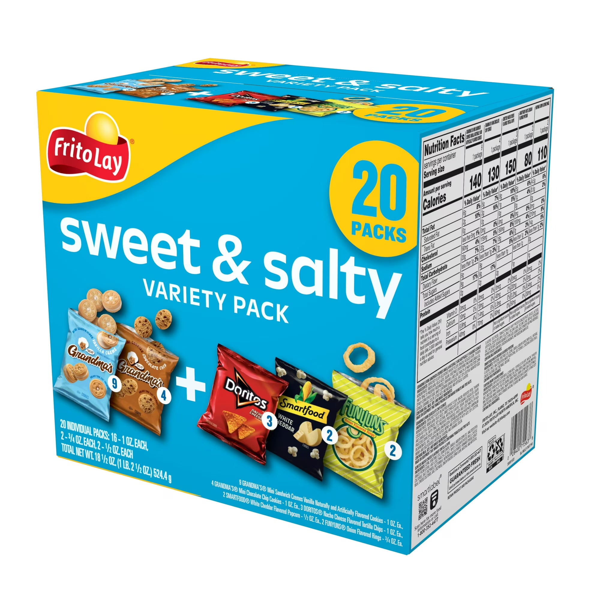 Grandma's Mini Sandwich Cremes Vanilla Naturally and Artificially Flavored Cookies: Enriched Flour (Bleached Wheat Flour, Niacin, Reduced Iron, Thiamin Mononitrate, Riboflavin, Folic Acid), Sugar, Vegetable Shortening (Palm and Canola Oil [with TBHQ to Preserve Freshness]), Skim Milk, and Less than 2% of High Fructose Corn Syrup, Corn Syrup, Eggs, Whey, Leavening (Baking Soda), Salt, Soy Lecithin, Modified Food Starch, Caramel Color, Citric Acid, and Natural and Artificial Flavors. Grandma's Mini Chocolate Chip Cookies: Enriched Flour (Bleached Wheat Flour, Niacin, Reduced Iron, Thiamin Mononitrate, Riboflavin, Folic Acid), Sweet Chocolate Chips (Sugar, Chocolate Liquor, Cocoa Butter, Dextrose, Soy Lecithin, Vanillin), Sugar, Vegetable Shortening (Palm and Canola Oil [with TBHQ to Preserve Freshness]), Whey, and Less than 2% of High Fructose Corn Syrup, Salt, Leavening (Baking Soda, Sodium Aluminum Phosphate, Ammonium Bicarbonate), Propylene Glycol Mono- and Diesters of Fats and Fatty Acids, Mono- and Diglycerides, Soy Lecithin, Artificial Flavors, and Caramel Color. Smartfood White Cheddar Flavored Popcorn: Popcorn, Vegetable Oil (Corn, Canola, and/or Sunflower Oil), Natural Flavors, Whey, Maltodextrin (Made from Corn), Buttermilk, Cheddar Cheese (Milk, Cheese Cultures, Salt, Enzymes), and Salt. Funyuns Onion Flavored Rings: Enriched Corn Meal (Corn Meal, Ferrous Sulfate, Niacin, Thiamin Mononitrate, Riboflavin, Folic Acid), Vegetable Oil (Corn, Canola, and/or Sunflower Oil), Salt, and Less than 2% of the Following: Corn Starch, Sugar, Corn Flour, Buttermilk, Maltodextrin (Made from Corn), Onion Powder, Monosodium Glutamate, Hydrolyzed Corn Protein, Dextrose, Garlic Powder, Natural Flavors, and Gum Arabic. Doritos Nachos Cheese Flavored Tortilla Chips: Corn, Vegetable Oil (Sunflower, Canola, and/or Corn Oil), Maltodextrin (Made from Corn), and Less than 2% of Salt, Whey, Cheddar Cheese (Milk, Cheese Cultures, Salt, Enzymes) Buttermilk, Monosodium Glutamate, Romano Cheese (Cow's Milk, Cheese Cultures, Salt, Enzymes) Onion Powder, Corn Flour, Natural and Artificial Flavors, Dextrose, Tomato Powder, Whey Protein Concentrate, Spices, Lactose, Artificial Color (Yellow 6, Yellow 5, Yellow 6 Lake, Yellow 5 Lake, Red 40), Potassium Salt, Lactic Acid, Sodium Caseinate, Citric Acid, Sugar, Garlic Powder, Red and Green Bell Pepper Powder, Skim Milk, Disodium Inosinate, and Disodium Guanylate.