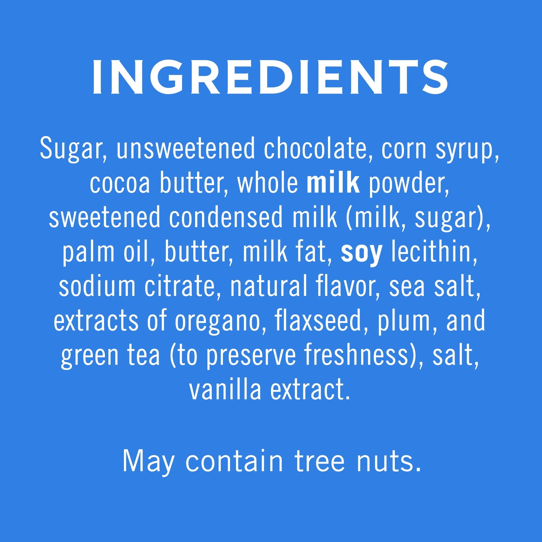 Ingredients: Sugar, unsweetened chocolate, corn syrup, cocoa butter, whole milk powder, sweetened condensed milk (milk, sugar), palm oil, butter, milk fat, soy lecithin, sodium citrate, natural flavor, sea salt, extracts of oregano, flaxseed, plum, and green tea (to preserve freshness), salt, vanilla extract./div>