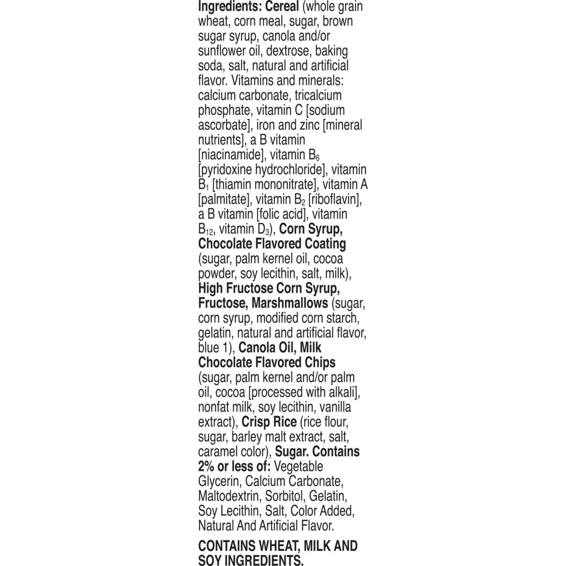 Cereal (whole grain wheat, corn meal, sugar, brown sugar syrup, canola and/or sunflower oil, dextrose, baking soda, salt, natural and artificial flavor. Vitamins and minerals: calcium carbonate, tricalcium phosphate, vitamin C [sodium ascorbate], iron and zinc [mineral nutrients], a B vitamin [niacinamide], vitamin B6 [pyridoxine hydrochloride], vitamin B1 [thiamin mononitrate], vitamin A [palmitate], vitamin B2 [riboflavin], a B vitamin [folic acid], vitamin B12, vitamin D3), Corn Syrup, Chocolate Flavored Coating (sugar, palm kernel oil, cocoa powder, soy lecithin, salt, milk), High Fructose Corn Syrup, Fructose, Marshmallows (sugar, corn syrup, modified corn starch, gelatin, natural and artificial flavor, blue 1), Canola Oil, Milk Chocolate Flavored Chips (sugar, palm kernel and/or palm oil, cocoa [processed with alkali], nonfat milk, soy lecithin, vanilla extract), Crisp Rice (rice flour, sugar, barley malt extract, salt, caramel color), Sugar. Contains 2% or less of: Vegetable Glycerin, Calcium Carbonate, Maltodextrin, Sorbitol, Gelatin, Soy Lecithin, Salt, Color Added, Natural And Artificial Flavor./div>