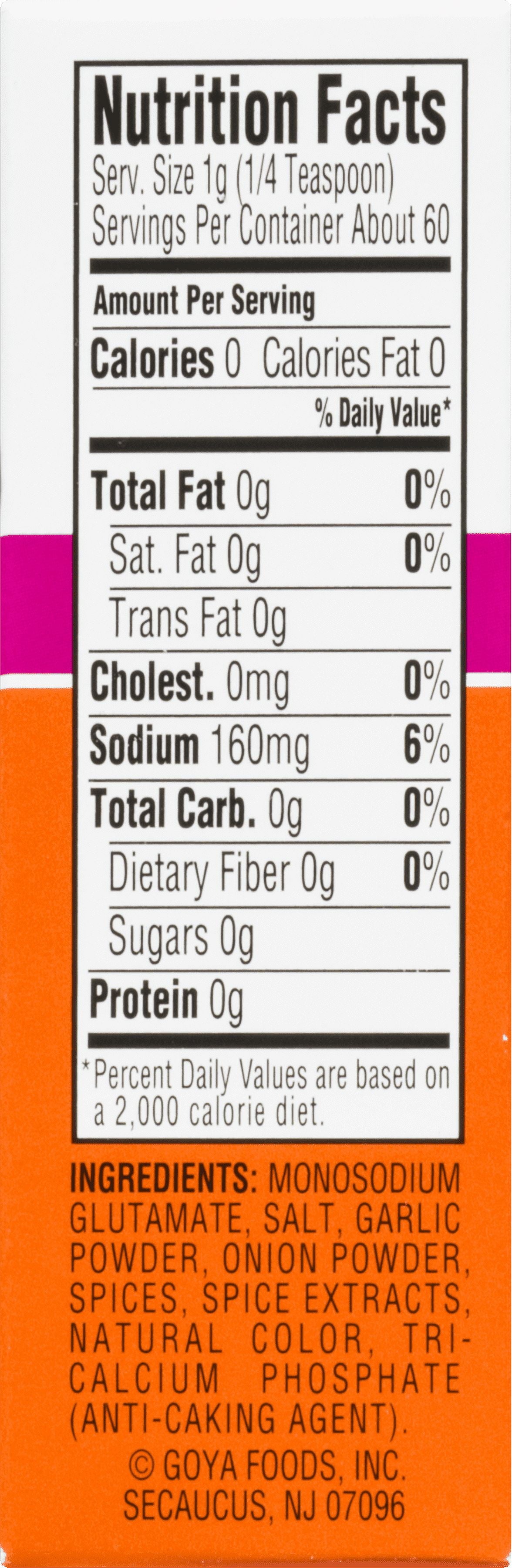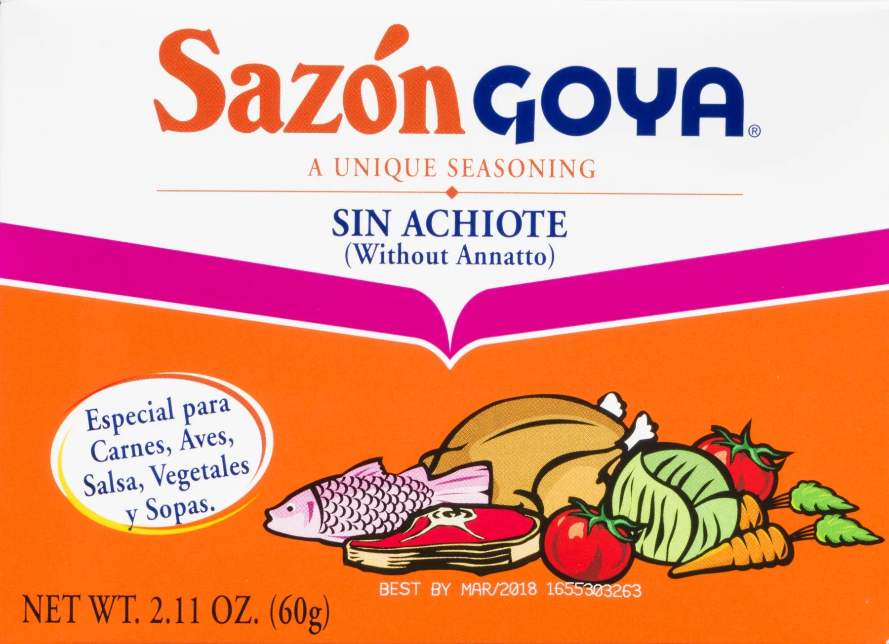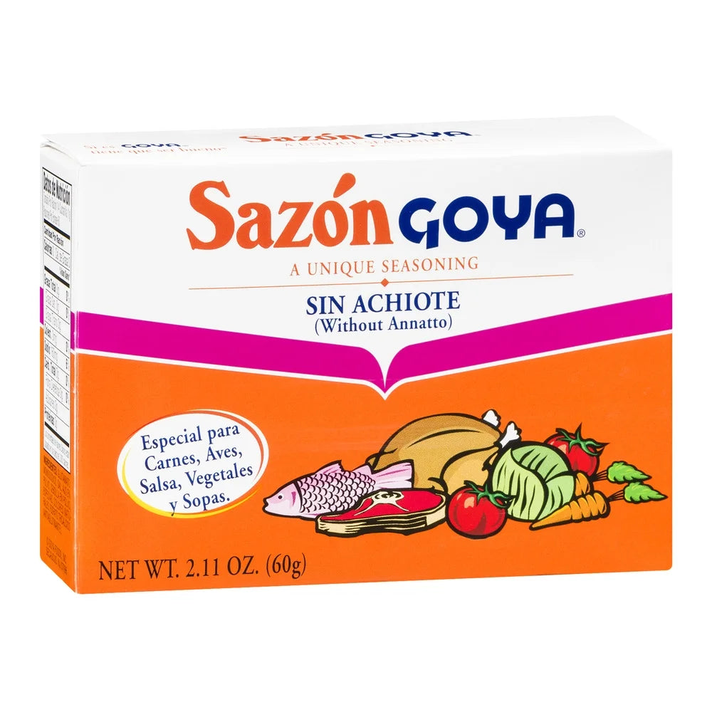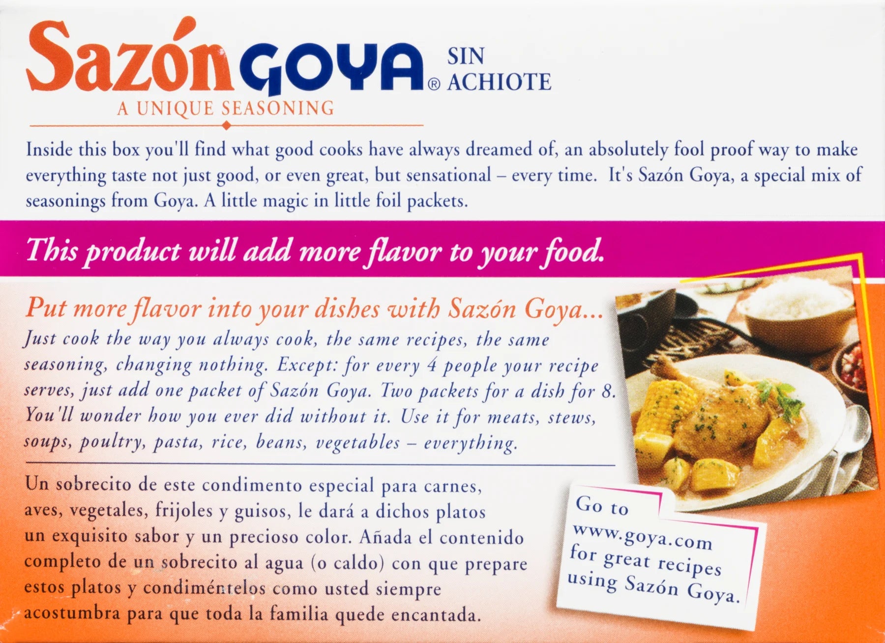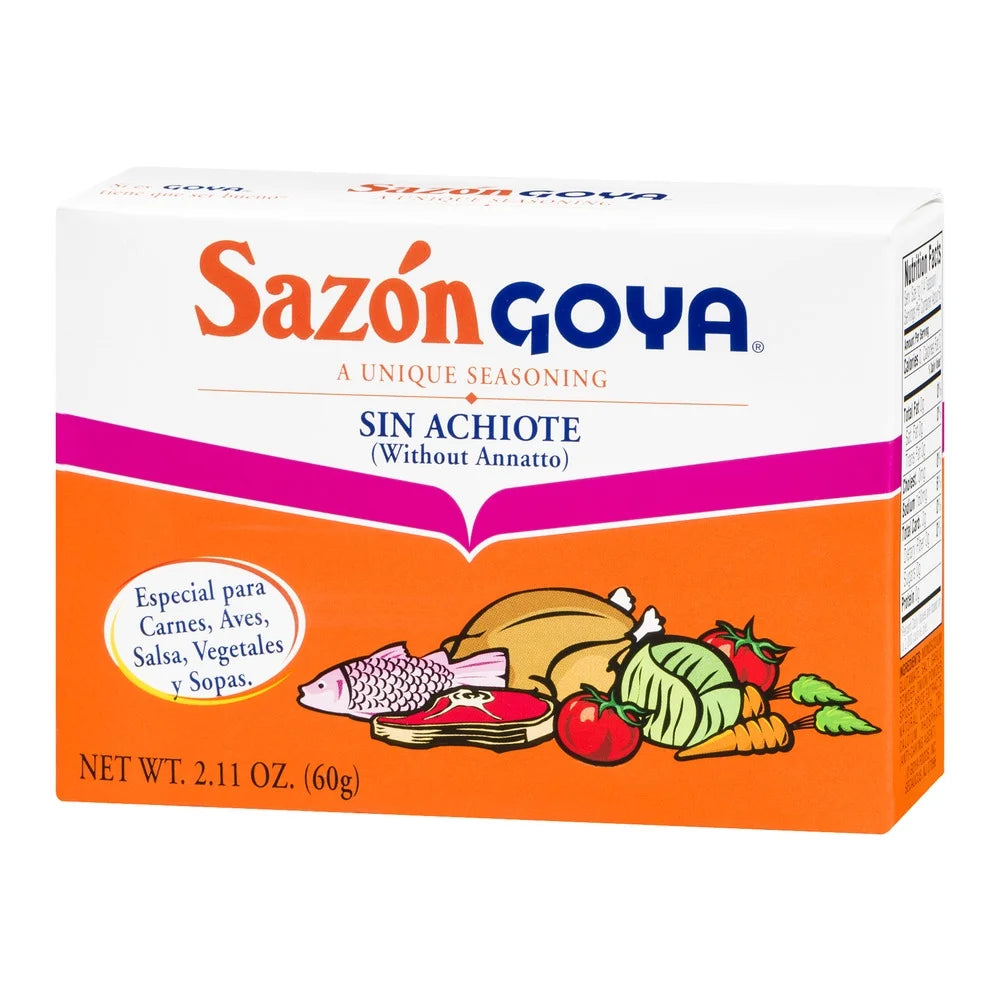Elevate your favorite recipes with the Goya Sazon without Annatto Seasoning. It features a delightful blend of ingredients that will add color and flavor to a meal. This Goya Sazon Seasoning makes an ideal addition to beef, chicken, salsa, vegetables, soups and more. It comes in little, easy-to-open foil packets.