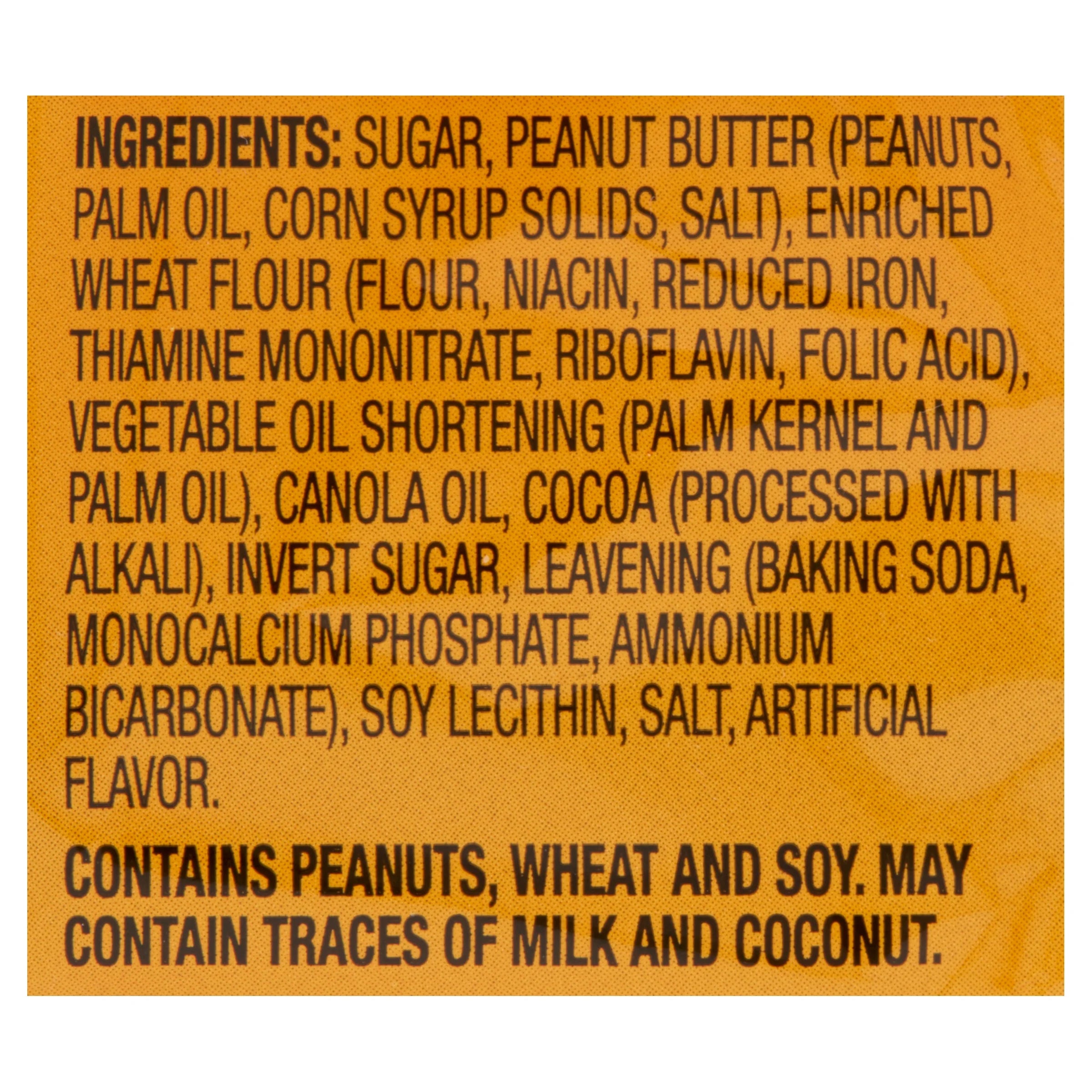 Ingredients: SUGAR, PEANUT BUTTER (PEANUTS, PALM OIL, CORN SYRUP SOLIDS, SALT), ENRICHED WHEAT FLOUR (FLOUR, NIACIN, REDUCED IRON, THIAMINE MONONITRATE, RIBOFLAVIN, FOLIC ACID), VEGETABLE OIL SHORTENING (CANOLA, PALM KERNEL AND PALM OILS), COCOA (PROCESSED WITH ALKALI), INVERT SYRUP, LEAVENING (BAKING SODA, MONOCALCIUM PHOSPHATE), SOY LECITHIN, SALT, ARTIFICIAL FLAVOR./div>