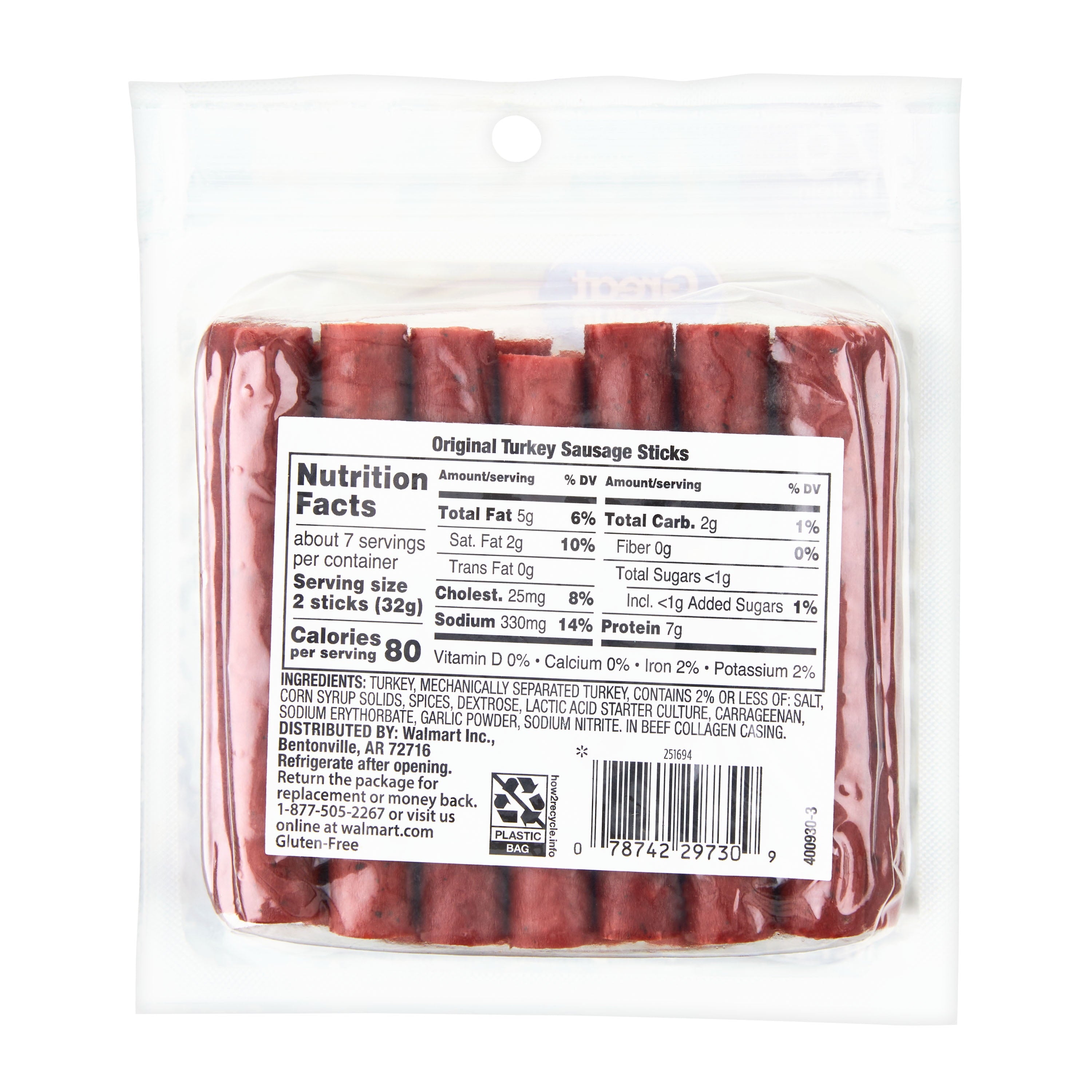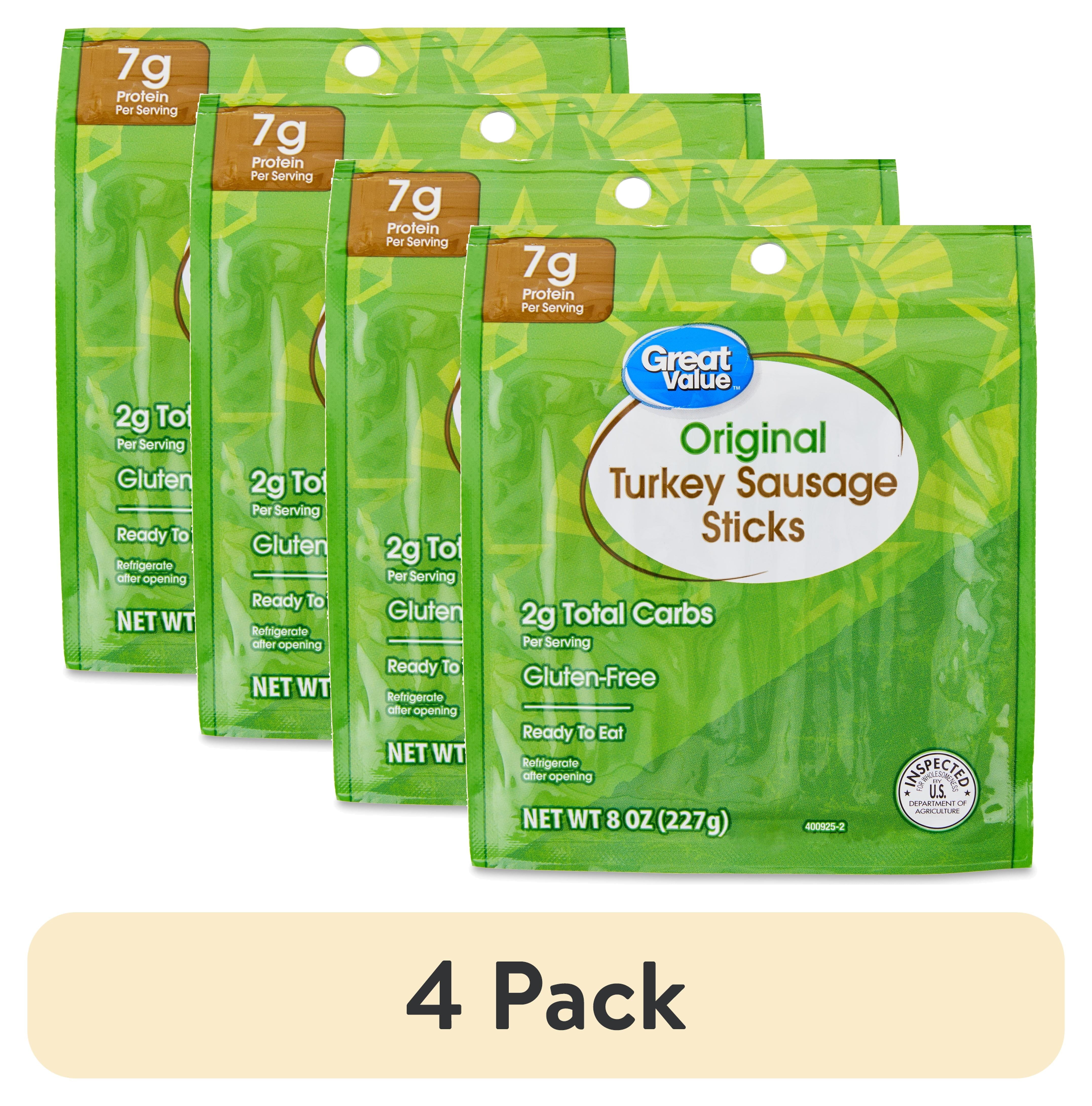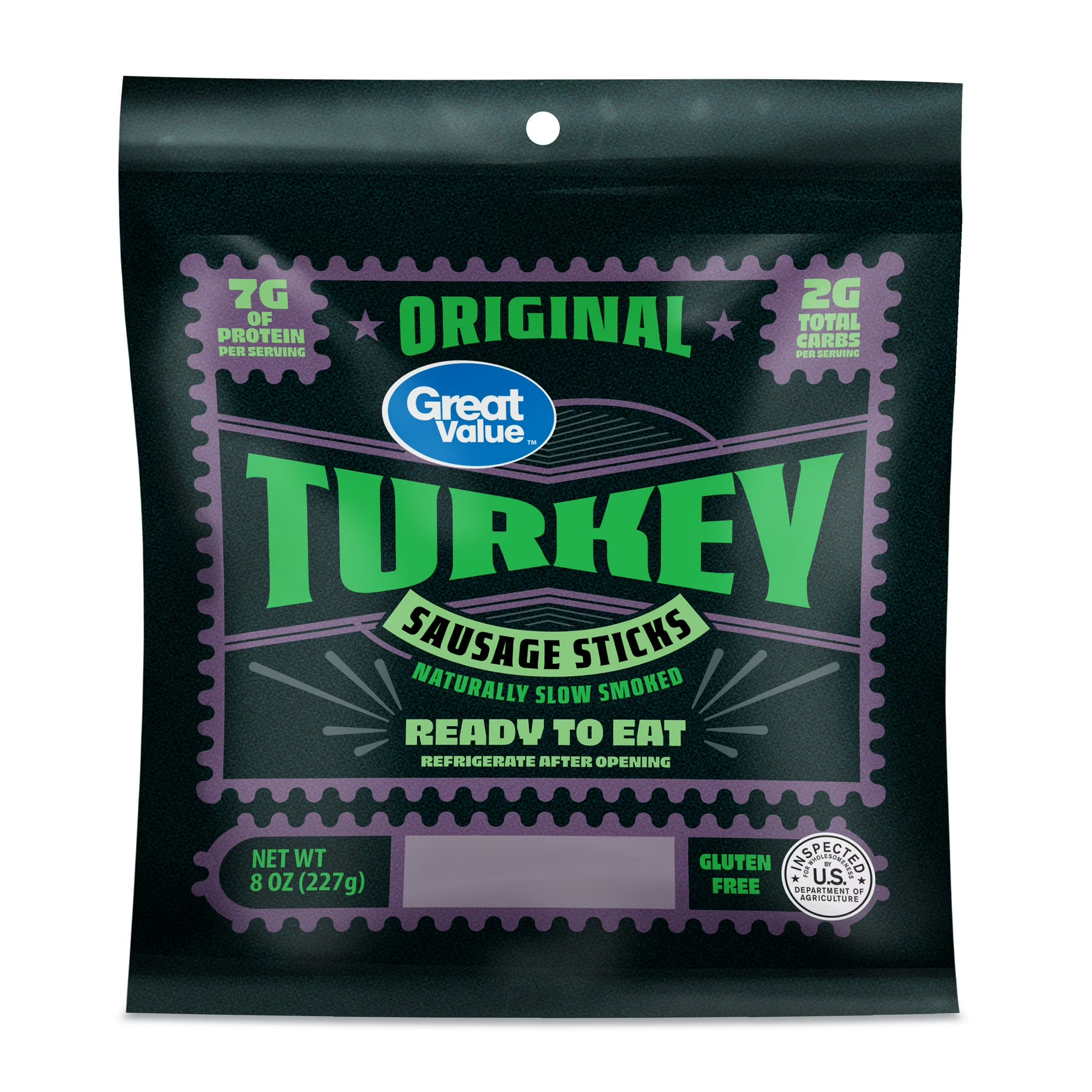 Make snack time more exciting when you purchase Great Value Turkey Sausage Snack Sticks 8oz. These original meat, shelf stable, fully cooked sticks are gluten free and perfect when you're on the road or need a quick protein boost in between meals. Featuring a rich smoked flavor, these turkey sticks are USDA inspected and ready to eat. Just grab them before your next hike or trip to the gym, or pack one in your kiddo's school lunch to ensure they're getting important nutrients. The sticks come in a handy, resealable plastic package, making it easy to store after opening. It's time to step it up a notch with Great Value Turkey Sausage Sticks! Great Value products provide families with affordable, high-quality grocery and household consumable options. With our wide range of product categories spanning grocery and household consumables, we offer you a variety of products for your family's needs. Our products are conveniently available online and in Walmart stores nationwide, allowing you to stock up and save money at the same time.