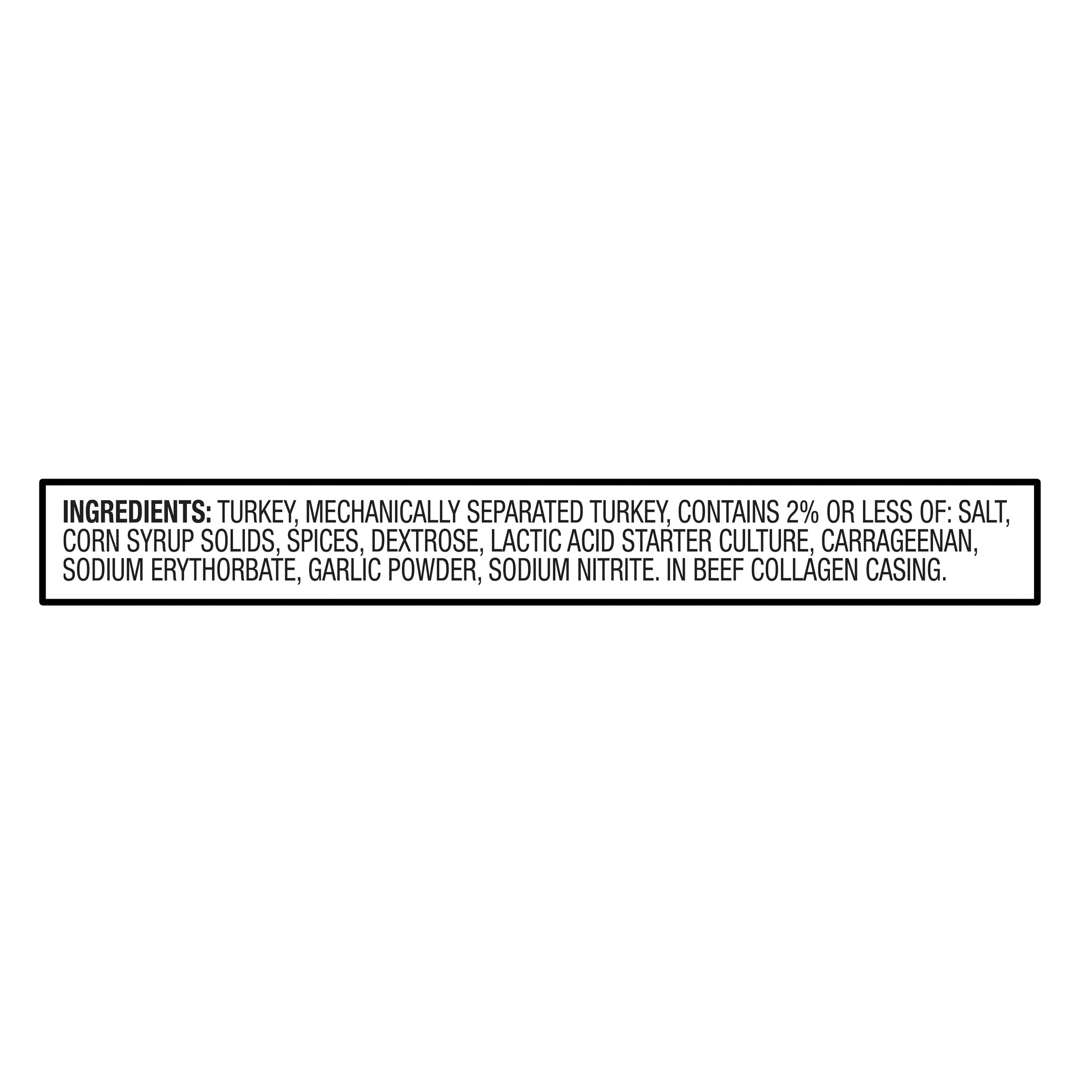 TURKEY, MECHANICALLY SEPARATED TURKEY, CONTAINS LESS THAN 2% OF: SALT, CORN SYRUP SOLIDS, SPICES, DEXTROSE, LACTIC ACID STARTER CULTURE, CARRAGEENAN, SODIUM ERYTHORBATE, GARLIC POWDER, SODIUM NITRITE. IN COLLAGEN CASING./div>