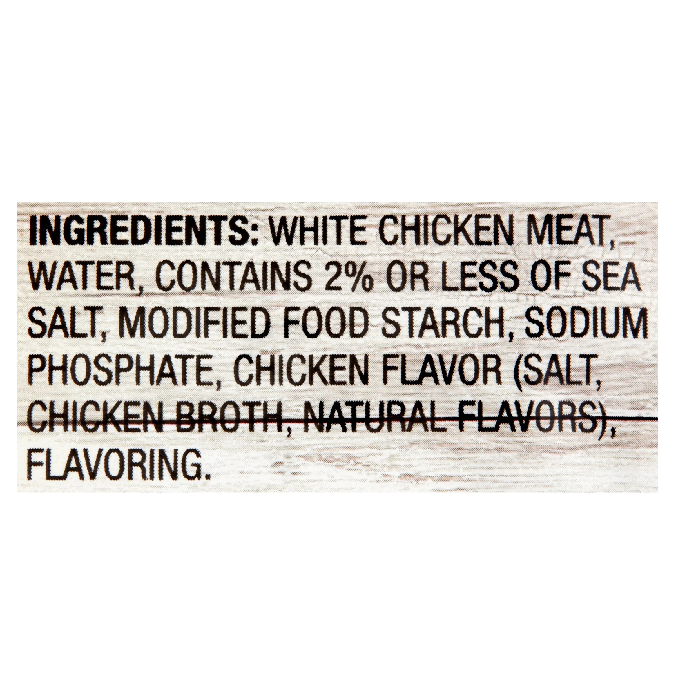 WHITE CHICKEN MEAT, WATER, CONTAINS 2% OR LESS OF SEA SALT, MODIFIED FOOD STARCH, SODIUM PHOSPHATE, CHICKEN FLAVOR (SALT, CHICKEN BROTH, NATURAL FLAVORS), FLAVORING./div>