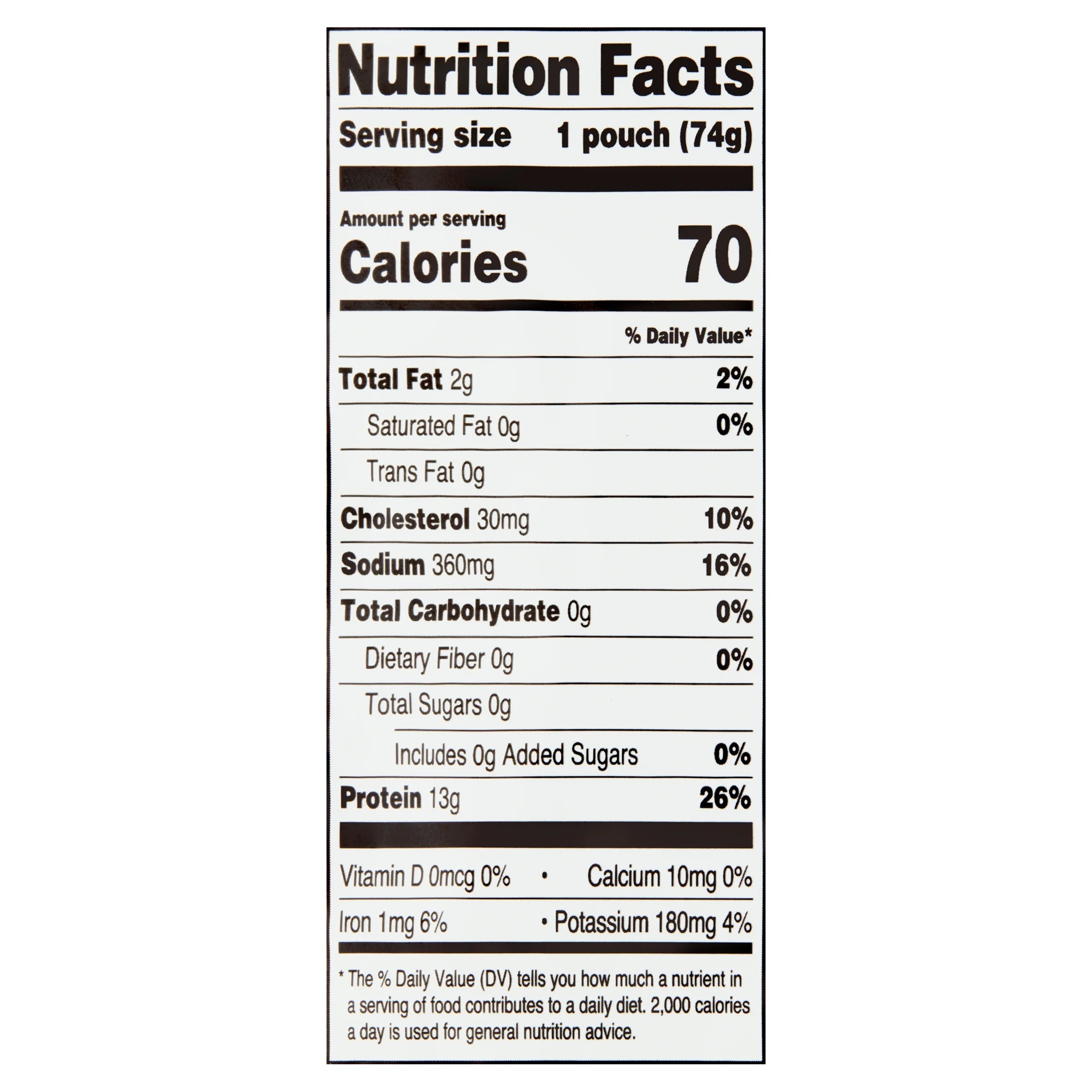 Add some delicious flavor to your next meal with Great Value Premium White Chicken. This chicken has an irresistible flavor, and you can enjoy it straight from the pouch. Made of white chicken meat. Use this fully-cooked chicken to top off a salad, or use it to add some flavor to your next pasta dish. Perfect to keep around for those busy weekday nights, this single-serving pouch has 13 grams of protein and only 70 calories per package. Your dinner just got better with gluten-free Great Value Premium White Chicken.