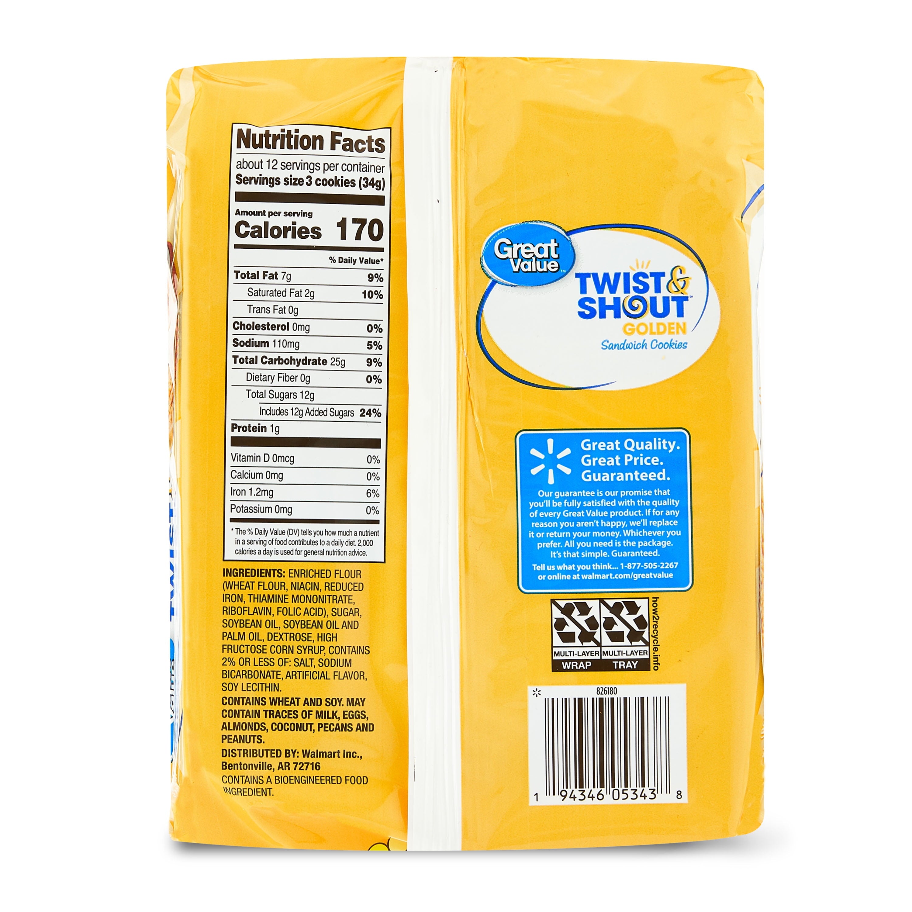 Delight in the simple pleasure of Great Value Twist & Shout Golden Sandwich Cookies. Enjoy them dunked into a glass of your favorite cold milk, twist off one of the cookies to enjoy an open-faced cookie sandwich, or maybe you're one of those people who likes to lick out all the cream before finishing the cookie. How ever you choose to enjoy your Twist & Shout Sandwich Cookie, you're guaranteed to have fun doing it. Parents can pack these as a special treat in school lunches, popping a few in their own bag for a little delight at work or on the go. With about 12 servings per package, they're the perfect treat to bring along to sports outings, camping trips, sleepover parties, and company potlucks. These cookies contain zero trans fats. Both the young and the young at heart will love Great Value Twist & Shout Golden Sandwich Cookies.