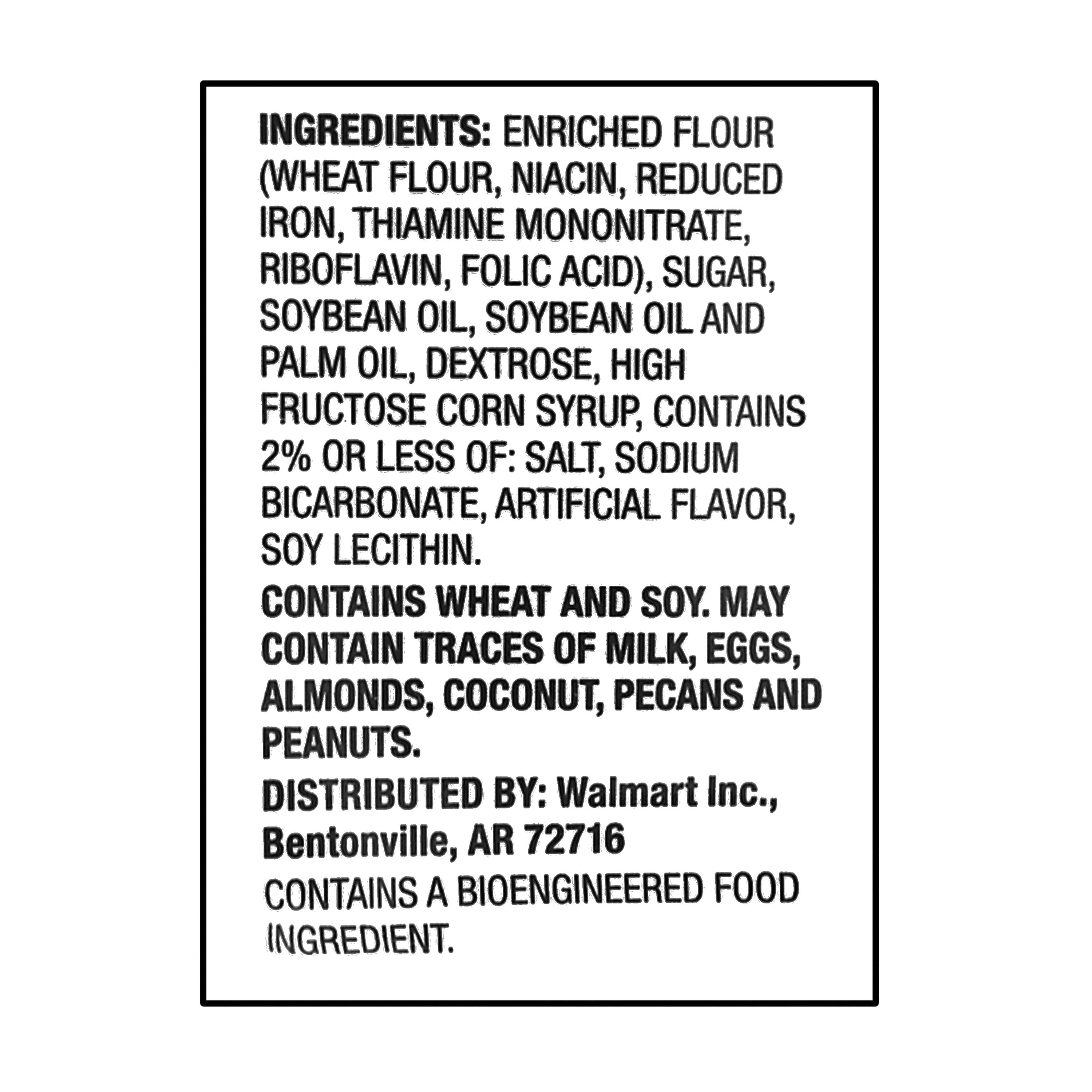 Enriched flour (wheat flour, niacin, reduced iron, thiamine mononitrate, riboflavin, folic acid), sugar, soybean oil, soybean oil and palm oil, dextrose, high fructose corn syrup, contains 2% or less of: salt, sodium bicarbonate, artificial flavor, soy lecithin/div>