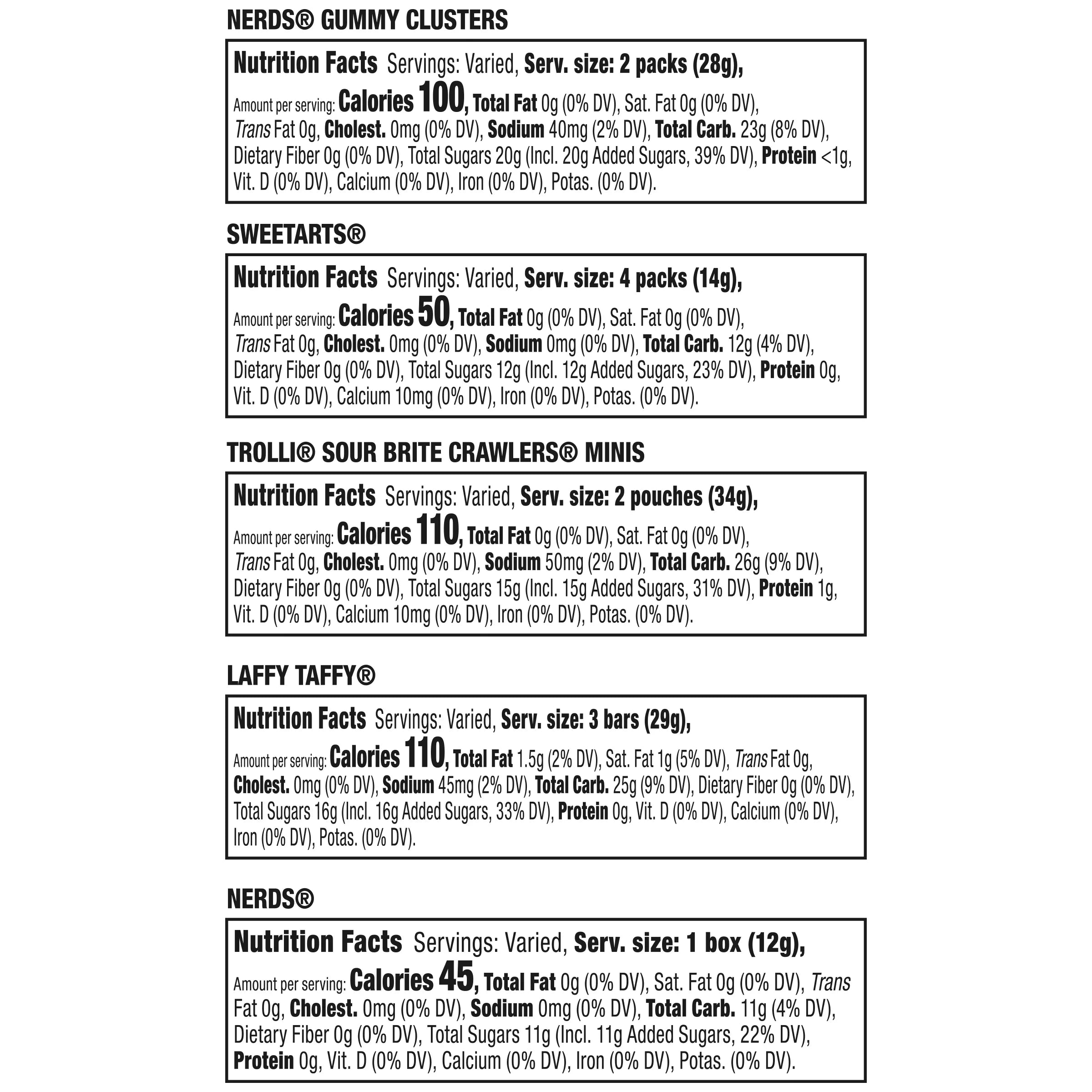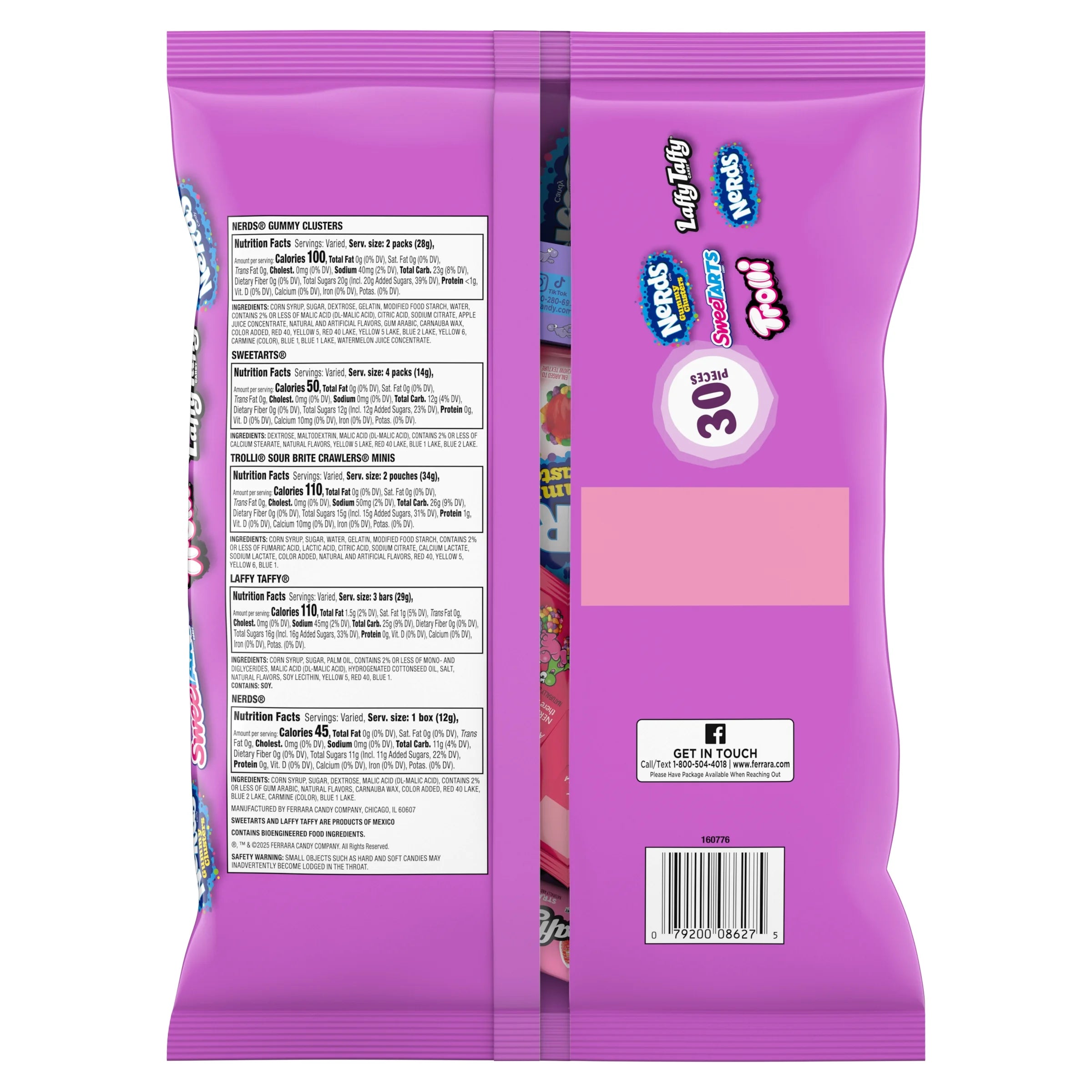 - GRAB-AND-GO, SHAREABLE TREATS: 30 individually wrapped candy pieces including Nerds Gummy Clusters, Nerds Candy Original Strawberry and Grape, Trolli Sour Brite Crawler Minis, SweeTARTS Original, and Laffy Taffy Candy Jokes on Every Wrapper.