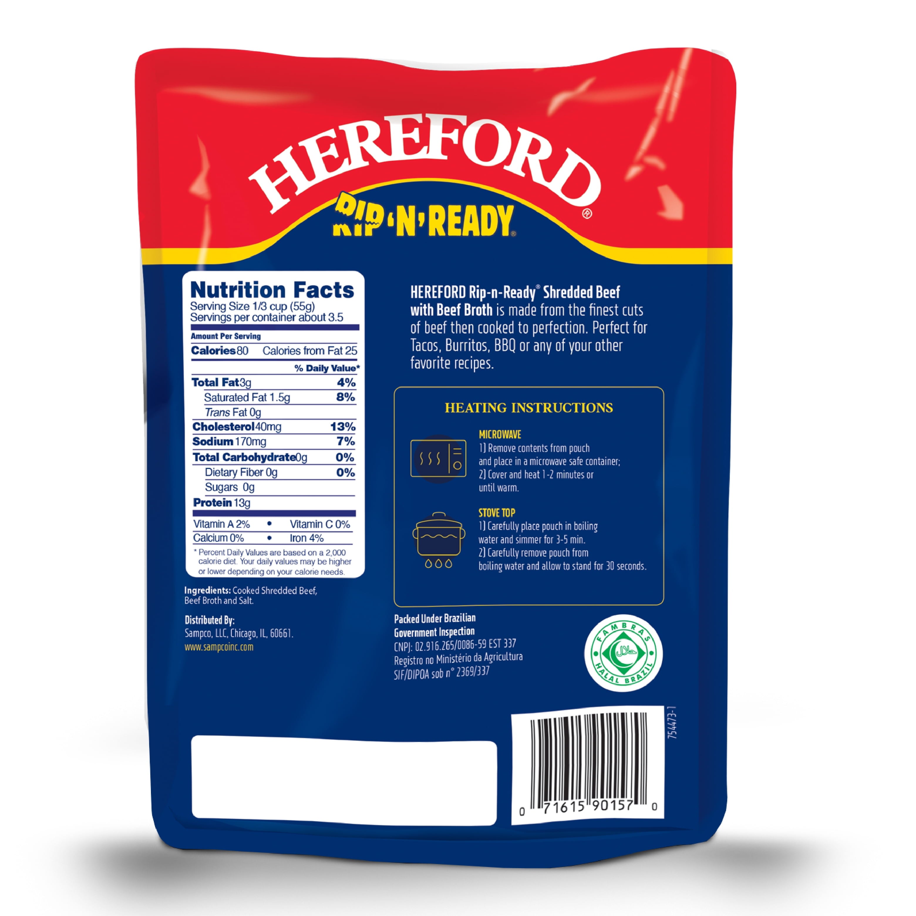 ALL FLAVOR, NO WORK - Hereford Shredded Beef is made from the finest cuts of beef, cooked to perfection and covered with delicious beef broth for hearty, delicious flavor without any of the work. FULLY COOKED - This shredded beef comes fully cooked and ready-to-eat or easy to heat with stovetop and microwave instructions right on the package. HEALTHY ALTERNATIVE - This beef and broth is gluten-free and contains no added hormones, sugar, preservatives or MSG. With 13 grams of protein, zero trans-fat and only 80 calories per serving, this meal is both satisfying and diet-friendly. SHELF STABLE - This pre-packaged meal comes in a seven-ounce vacuum-sealed, shelf-stable pouch that does not require refrigeration, so you can enjoy a meal or snack anywhere and anytime. DESIGNED FOR CONVENIENCE - Our food pouches are ideal for tailgating, backpacking, camping, hunting, hiking and preparing emergency food or survival kits.