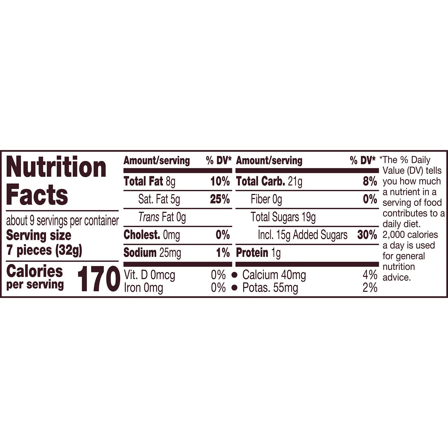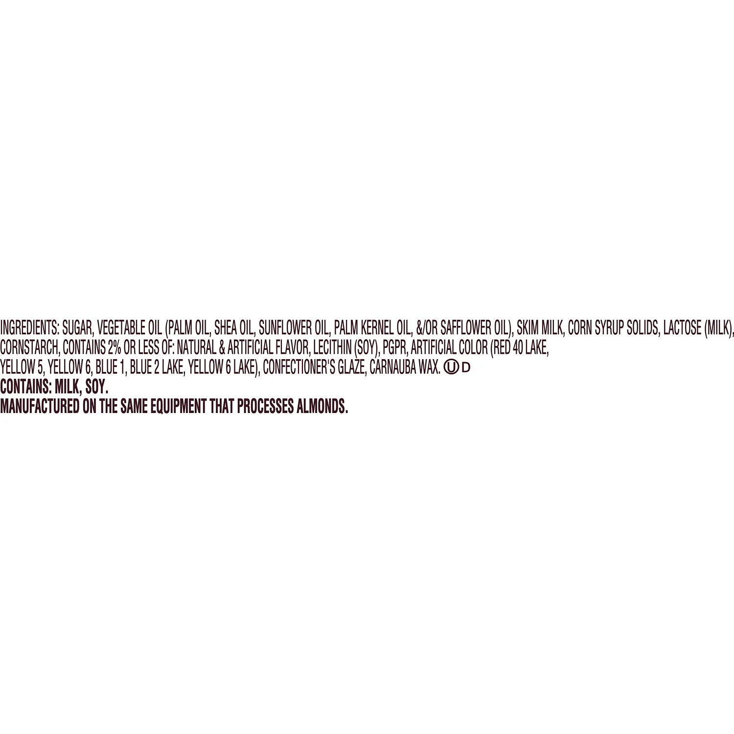 SUGAR, VEGETABLE OIL (PALM OIL, SHEA OIL, SUNFLOWER OIL, PALM KERNEL OIL, &/OR SAFFLOWER OIL), SKIM MILK, CORN SYRUP SOLIDS, LACTOSE (MILK), CORNSTARCH, CONTAINS 2% OR LESS OF: NATURAL & ARTIFICIAL FLAVOR, LECITHIN (SOY), CARNAUBA WAX, CONFECTIONER'S GLAZE, PGPR, ARTIFICIAL COLOR (YELLOW 5, RED 40 LAKE, BLUE 1, BLUE 2 LAKE, YELLOW 6 LAKE, YELLOW 6)./div>